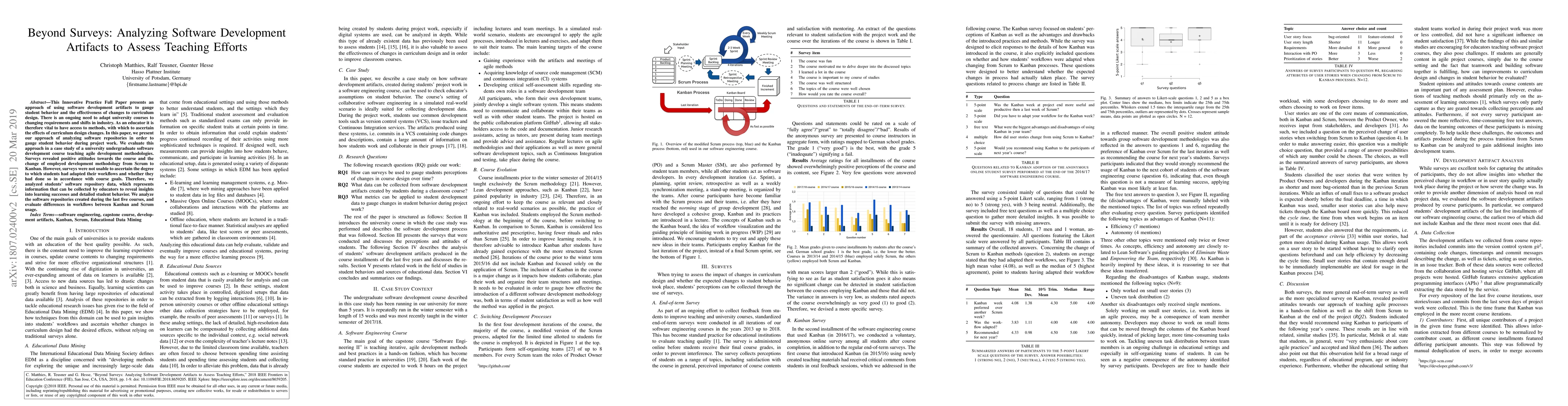 This Innovative Practice Full Paper presents an approach of using software development artifacts to gauge student behavior and the effectiveness of changes to curriculum design. There is an ongoing need to adapt university courses to changing requirements and shifts in industry. As an educator it is therefore vital to have access to methods, with which to ascertain the effects of curriculum design changes. In this paper, we present our approach of analyzing software repositories in order to gauge student behavior during project work. We evaluate this approach in a case study of a university undergraduate software development course teaching agile development methodologies. Surveys revealed positive attitudes towards the course and the change of employed development methodology from Scrum to Kanban. However, surveys were not usable to ascertain the degree to which students had adapted their workflows and whether they had done so in accordance with course goals. Therefore, we analyzed students' software repository data, which represents information that can be collected by educators to reveal insights into learning successes and detailed student behavior. We analyze the software repositories created during the last five courses, and evaluate differences in workflows between Kanban and Scrum usage.