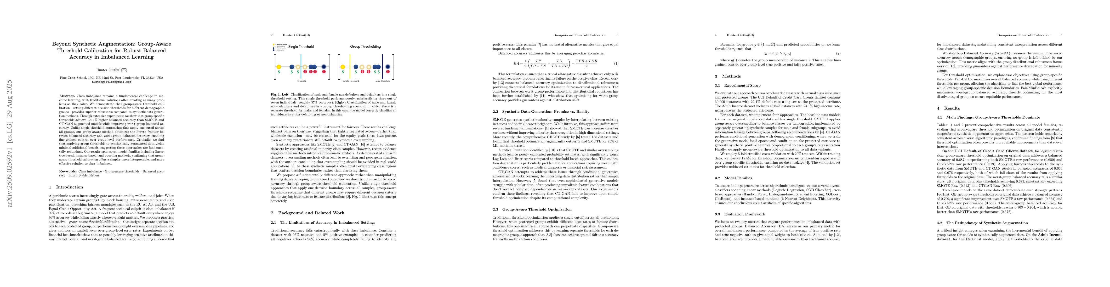 Class imbalance remains a fundamental challenge in machine learning, with traditional solutions often creating as many problems as they solve. We demonstrate that group-aware threshold calibration--setting different decision thresholds for different demographic groups--provides superior robustness compared to synthetic data generation methods. Through extensive experiments, we show that group-specific thresholds achieve 1.5-4% higher balanced accuracy than SMOTE and CT-GAN augmented models while improving worst-group balanced accuracy. Unlike single-threshold approaches that apply one cutoff across all groups, our group-aware method optimizes the Pareto frontier between balanced accuracy and worst-group balanced accuracy, enabling fine-grained control over group-level performance. Critically, we find that applying group thresholds to synthetically augmented data yields minimal additional benefit, suggesting these approaches are fundamentally redundant. Our results span seven model families including linear, tree-based, instance-based, and boosting methods, confirming that group-aware threshold calibration offers a simpler, more interpretable, and more effective solution to class imbalance.
