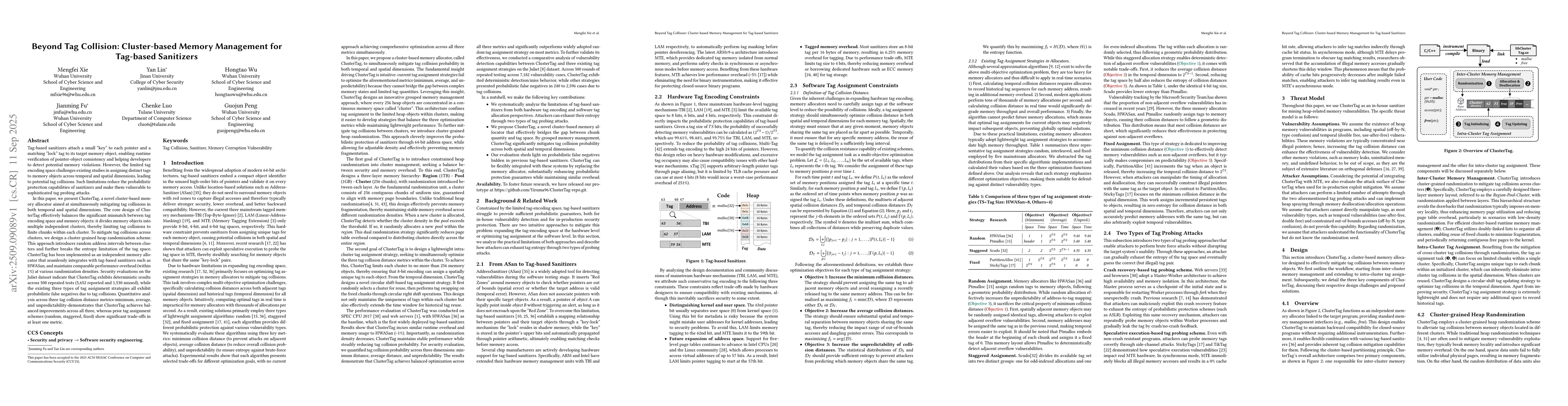 Tag-based sanitizers attach a small "key" to each pointer and a matching "lock" tag to its target memory object, enabling runtime verification of pointer-object consistency and helping developers to detect potential memory violations. However, the limited tag encoding space challenges existing studies in assigning distinct tags to memory objects across temporal and spatial dimensions, leading to potential tag collisions. In this paper, we present ClusterTag, a novel cluster-based memory allocator aimed at simultaneously mitigating tag collisions in both temporal and spatial dimensions. The core design of ClusterTag effectively balances the significant mismatch between tag encoding space and memory objects: it divides memory objects into multiple independent clusters, thereby limiting tag collisions to finite chunks within each cluster. To mitigate tag collisions across clusters, we design a cluster-grained heap randomization scheme. This approach introduces random address intervals between clusters and further breaks the entropy limitation of the tag space. ClusterTag has been implemented as an independent memory allocator that seamlessly integrates with tag-based sanitizers such as HWASan, and maintains comparable performance overhead (within 1%) at various randomization densities. Security evaluations on the Juliet dataset indicate that ClusterTag exhibits deterministic results across 500 repeated tests (5,652 reported and 1,530 missed), while the existing three types of tag assignment strategies all exhibit probabilistic false negatives due to tag collisions. Quantitative analysis across three tag collision distance metrics-minimum, average, and unpredictability-demonstrates that ClusterTag achieves balanced improvements across all three, whereas prior tag assignment schemes (random, staggered, fixed) show significant trade-offs in at least one metric.