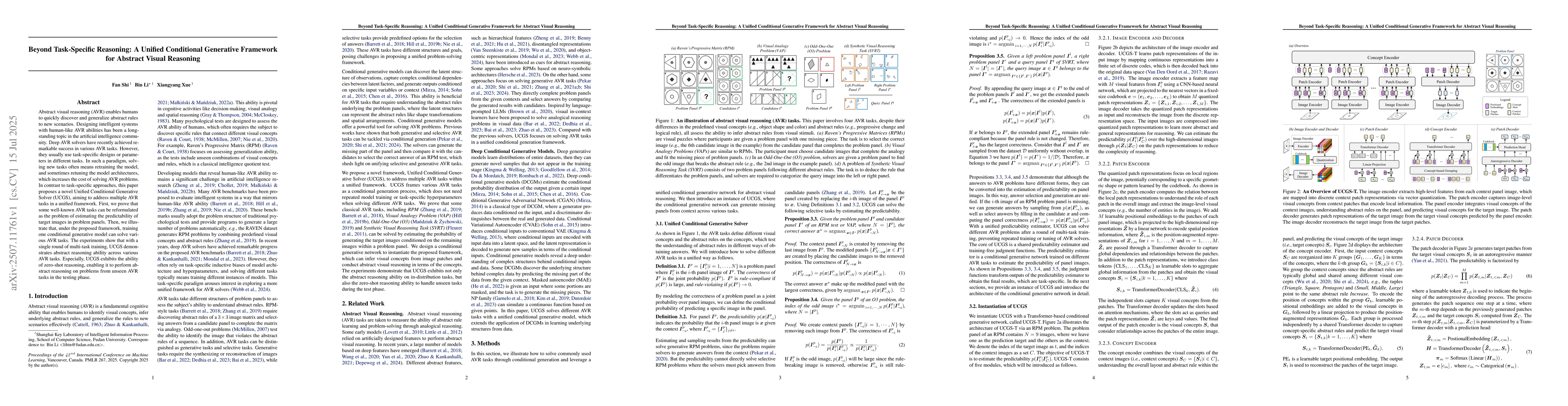 Abstract visual reasoning (AVR) enables humans to quickly discover and generalize abstract rules to new scenarios. Designing intelligent systems with human-like AVR abilities has been a long-standing topic in the artificial intelligence community. Deep AVR solvers have recently achieved remarkable success in various AVR tasks. However, they usually use task-specific designs or parameters in different tasks. In such a paradigm, solving new tasks often means retraining the model, and sometimes retuning the model architectures, which increases the cost of solving AVR problems. In contrast to task-specific approaches, this paper proposes a novel Unified Conditional Generative Solver (UCGS), aiming to address multiple AVR tasks in a unified framework. First, we prove that some well-known AVR tasks can be reformulated as the problem of estimating the predictability of target images in problem panels. Then, we illustrate that, under the proposed framework, training one conditional generative model can solve various AVR tasks. The experiments show that with a single round of multi-task training, UCGS demonstrates abstract reasoning ability across various AVR tasks. Especially, UCGS exhibits the ability of zero-shot reasoning, enabling it to perform abstract reasoning on problems from unseen AVR tasks in the testing phase.