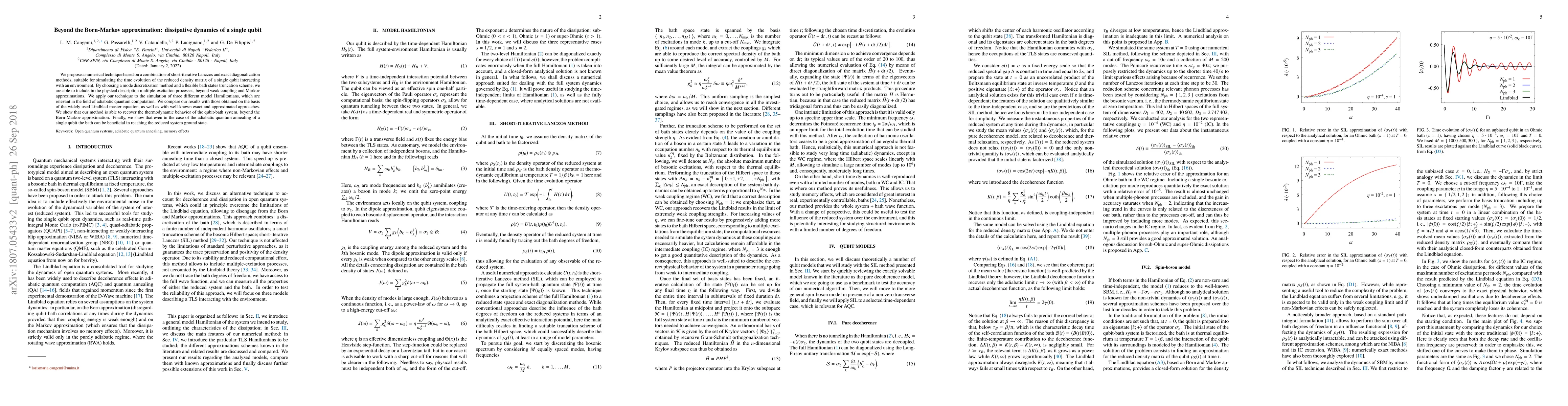 We propose a numerical technique based on a combination of short-iterative Lanczos and exact diagonalization methods, suitable for simulating the time evolution of the reduced density matrix of a single qubit interacting with an environment. By choosing a mode discretization method and a flexible bath states truncation scheme, we are able to include in the physical description multiple-excitation processes, beyond weak coupling and Markov approximations. We apply our technique to the simulation of three different model Hamiltonians, which are relevant in the field of adiabatic quantum computation. We compare our results with those obtained on the basis of the widely used Lindblad master equation, as well as with well-known exact and approximated approaches. We show that our method is able to recover the thermodynamic behavior of the qubit-bath system, beyond the Born-Markov approximation. Finally, we show that even in the case of the adiabatic quantum annealing of a single qubit the bath can be beneficial in reaching the reduced system ground state.