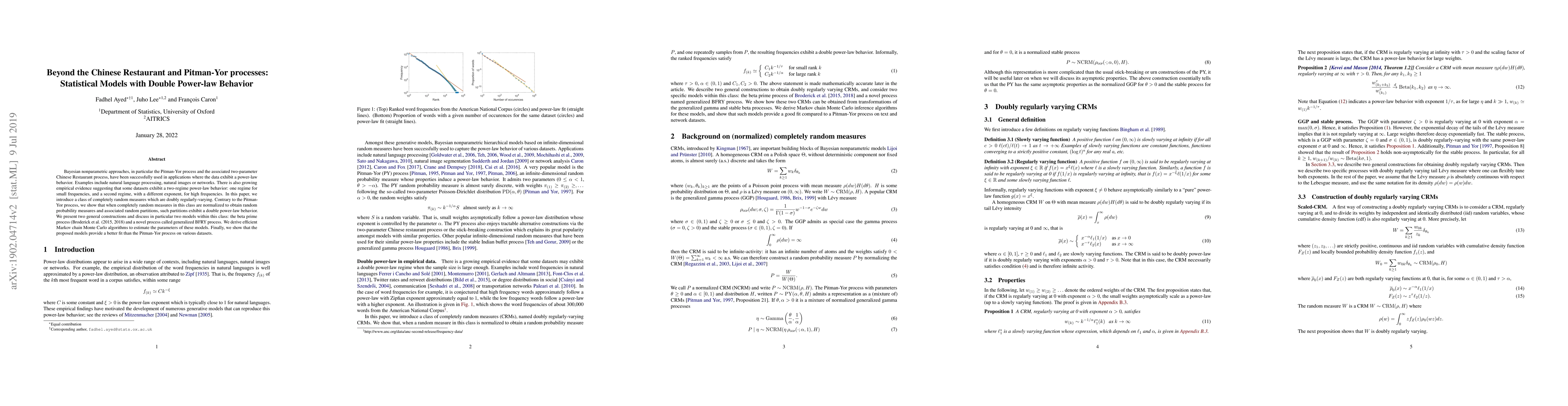 This paper introduces new statistical models for data exhibiting double power-law behavior, contrasting with the Pitman-Yor process. It proposes three models—beta prime process, a novel generalized BFRY process, and a mixture construction—that better fit datasets with two-regime power-law distributions than existing methods.
