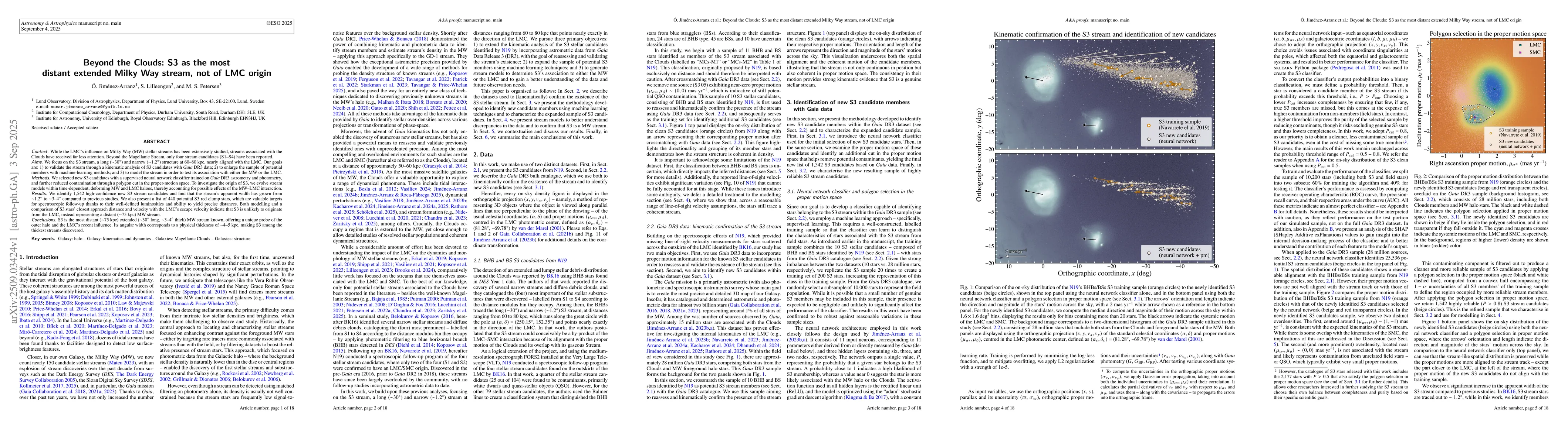 Context: While the LMC's influence on MW stellar streams has been extensively studied, streams associated with the Clouds have received far less attention. Beyond the Magellanic Stream, only four stream candidates (S1-S4) have been reported. Aims: We focus on the S3 stream, a long ($\sim30^\circ$) and narrow ($\sim1.2^\circ$) structure at 60-80 kpc, nearly aligned with the LMC. Our goals are: 1) to validate the stream through a kinematic analysis of S3 candidates with Gaia DR3 data; 2) to enlarge the sample of potential members; and 3) to model the stream in order to test its association with either the MW or the LMC. Methods: We selected new S3 candidates with a neural network classifier trained on Gaia DR3 data, and further reduced contamination through a cut in the proper-motion space. To investigate the origin of S3, we evolve stream models within time-dependent, deforming MW and LMC haloes, thereby accounting for possible effects of the MW-LMC interaction. Results: We identify 1,542 high-confidence new S3 stream candidates and find that the stream's apparent width has grown from $\sim1.2^\circ$ to $\sim3$-$4^\circ$ compared to previous studies. We also present a list of 440 potential S3 red clump stars, which are valuable targets for spectroscopic follow-up thanks to their well-defined luminosities and ability to yield precise distances. Both modelling and a comparison of S3 stars' closest approach distance and velocity with the LMC's escape velocity indicate that S3 is unlikely to originate from the LMC, instead representing a distant ($\sim75$ kpc) MW stream. Conclusions: S3 is the most distant ($\sim75$ kpc) extended ($\sim30^\circ$ long, $\sim3$-$4^\circ$ thick) MW stream known, offering a unique probe of the outer halo and the LMC's recent influence. Its angular width corresponds to a physical thickness of $\sim4$-5 kpc, making S3 among the thickest streams discovered.