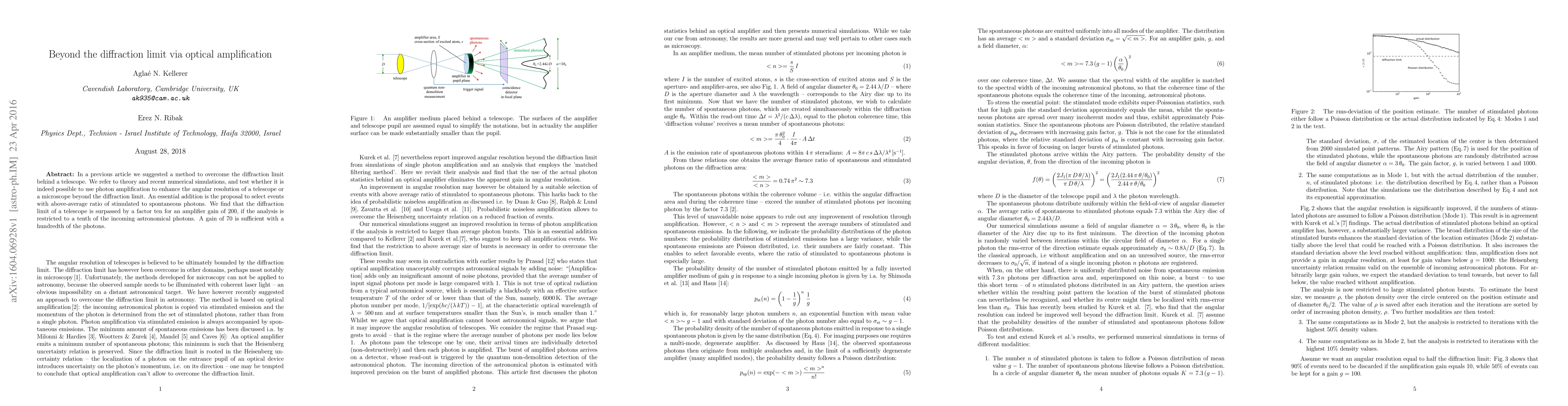 In a previous article we suggested a method to overcome the diffraction limit behind a telescope. We refer to theory and recent numerical simulations, and test whether it is indeed possible to use photon amplification to enhance the angular resolution of a telescope or a microscope beyond the diffraction limit. An essential addition is the proposal to select events with above-average ratio of stimulated to spontaneous photons. We find that the diffraction limit of a telescope is surpassed by a factor ten for an amplifier gain of 200, if the analysis is restricted to a tenth of the incoming astronomical photons. A gain of 70 is sufficient with a hundredth of the photons.