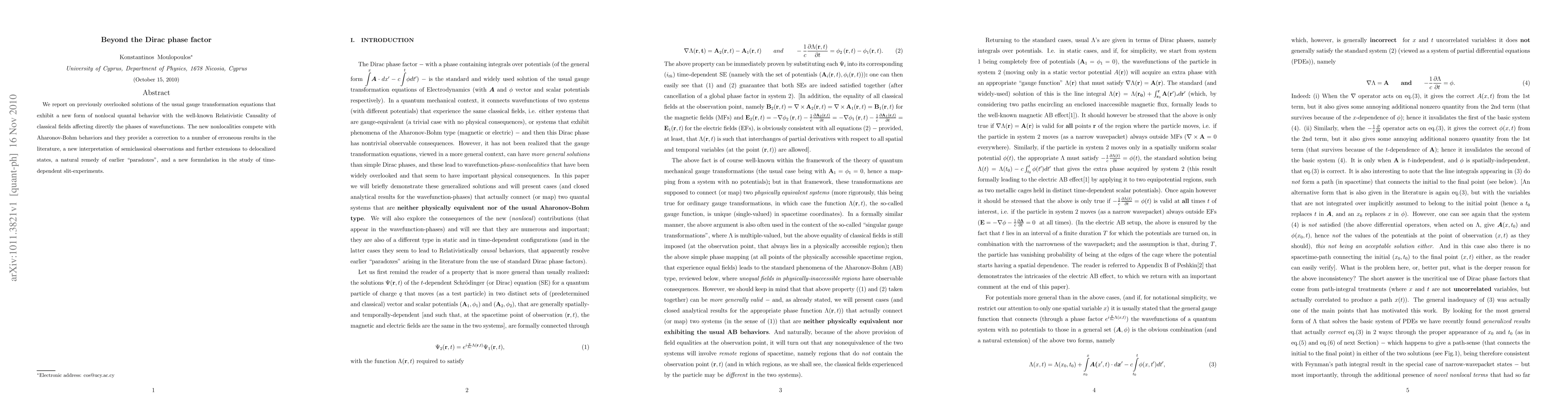 We report on previously overlooked solutions of the usual gauge transformation equations that exhibit a new form of nonlocal quantal behavior with the well-known Relativistic Causality of classical fields affecting directly the phases of wavefunctions. The new nonlocalities compete with Aharonov-Bohm behaviors and they provide: a correction to a number of erroneous results in the literature, a new interpretation of semiclassical observations and further extensions to delocalized states, a natural remedy of earlier "paradoxes", and a new formulation in the study of time-dependent slit-experiments.