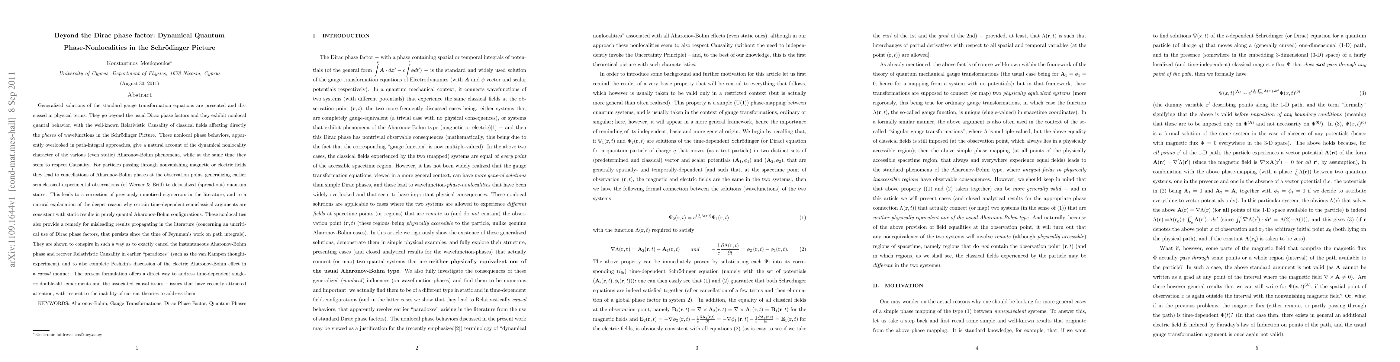 Generalized solutions of the standard gauge transformation equations are presented and discussed in physical terms. They go beyond the usual Dirac phase factors and they exhibit nonlocal quantal behavior, with the well-known Relativistic Causality of classical fields affecting directly the phases of wavefunctions in the Schr\"odinger Picture. These nonlocal phase behaviors, apparently overlooked in path-integral approaches, give a natural account of the dynamical nonlocality character of the various (even static) Aharonov-Bohm phenomena, while at the same time they seem to respect Causality. For particles passing through nonvanishing magnetic or electric fields they lead to cancellations of Aharonov-Bohm phases at the observation point, generalizing earlier semiclassical experimental observations (of Werner & Brill) to delocalized (spread-out) quantum states. This leads to a correction of previously unnoticed sign-errors in the literature, and to a natural explanation of the deeper reason why certain time-dependent semiclassical arguments are consistent with static results in purely quantal Aharonov-Bohm configurations. These nonlocalities also provide a remedy for misleading results propagating in the literature (concerning an uncritical use of Dirac phase factors, that persists since the time of Feynman's work on path integrals). They are shown to conspire in such a way as to exactly cancel the instantaneous Aharonov-Bohm phase and recover Relativistic Causality in earlier " paradoxes" (such as the van Kampen thought-experiment), and to also complete Peshkin's discussion of the electric Aharonov-Bohm effect in a causal manner. The present formulation offers a direct way to address time-dependent single- vs double-slit experiments and the associated causal issues -- issues that have recently attracted attention, with respect to the inability of current theories to address them.