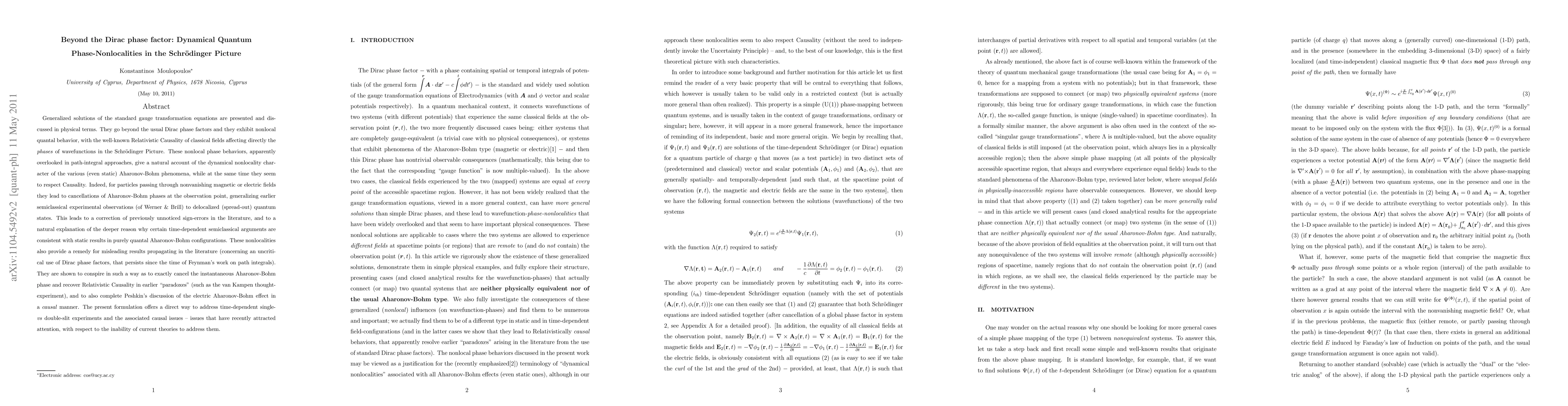 Generalized solutions of the standard gauge transformation equations are presented and discussed in physical terms. They go beyond the usual Dirac phase factors and they exhibit nonlocal quantal behavior, with the well-known Relativistic Causality of classical fields affecting directly the phases of wavefunctions in the Schroedinger Picture. These nonlocal phase behaviors, apparently overlooked in path-integral approaches, give a natural account of the dynamical nonlocality character of the various (even static) Aharonov-Bohm phenomena, while at the same time they seem to respect Causality. Indeed, for particles passing through nonvanishing magnetic or electric fields they lead to cancellations of Aharonov-Bohm phases at the observation point, generalizing earlier semiclassical experimental observations (of Werner & Brill) to delocalized (spread-out) quantum states. This leads to a correction of previously unnoticed sign-errors in the literature, and to a natural explanation of the deeper reason why certain time-dependent semiclassical arguments are consistent with static results in purely quantal Aharonov-Bohm configurations. These nonlocalities also provide a remedy for misleading results propagating in the literature (concerning an uncritical use of Dirac phase factors, that persists since the time of Feynman's work on path integrals). They are shown to conspire in such a way as to exactly cancel the instantaneous Aharonov-Bohm phase and recover Relativistic Causality in earlier "paradoxes" (such as the van Kampen thought-experiment), and to also complete Peshkin's discussion of the electric Aharonov-Bohm effect in a causal manner. The present formulation offers a direct way to address time-dependent single- vs double-slit experiments and the associated causal issues -- issues that have recently attracted attention, with respect to the inability of current theories to address them.