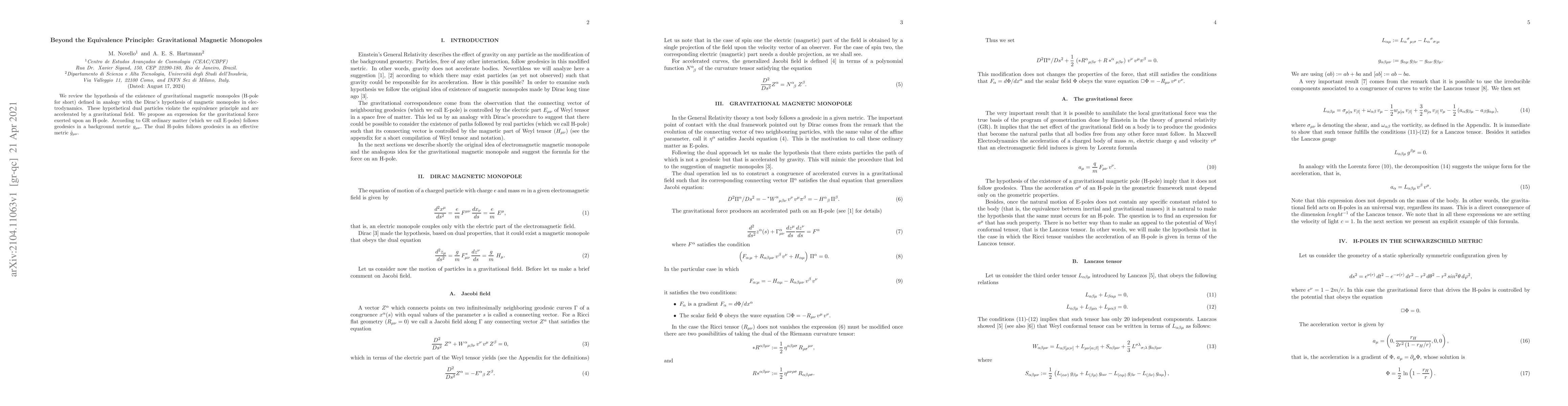 This paper reviews the hypothesis of gravitational magnetic monopoles (H-poles), which, analogous to magnetic monopoles in electrodynamics, violate the equivalence principle and are influenced by gravitational fields. The authors propose an expression for the gravitational force on H-poles, suggesting they follow geodesics in an effective metric rather than the standard metric followed by ordinary matter (E-poles).