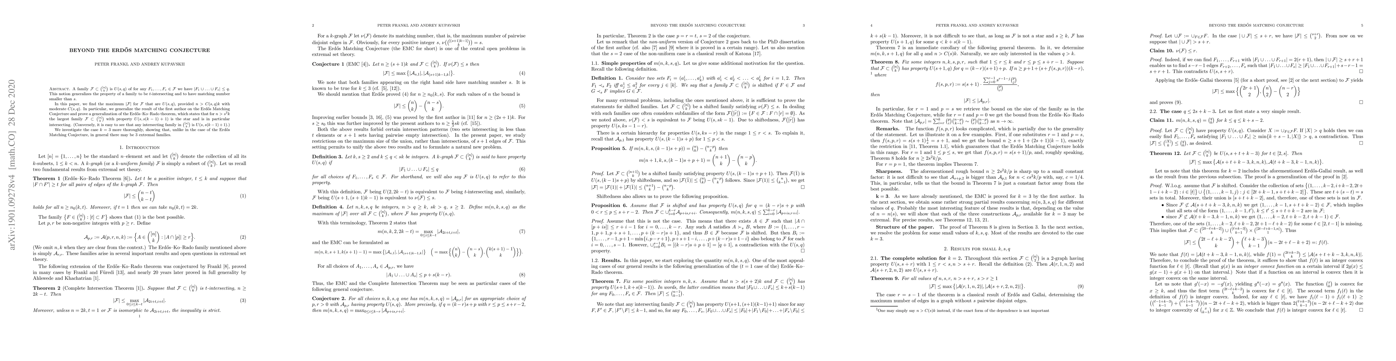 A family $\mathcal F\subset {[n]\choose k}$ is $U(s,q)$ of for any $F_1,\ldots, F_s\in \mathcal F$ we have $|F_1\cup\ldots\cup F_s|\le q$. This notion generalizes the property of a family to be $t$-intersecting and to have matching number smaller than $s$. In this paper, we find the maximum $|\mathcal F|$ for $\mathcal F$ that are $U(s,q)$, provided $n>C(s,q)k$ with moderate $C(s,q)$. In particular, we generalize the result of the first author on the Erd\H{o}s Matching Conjecture and prove a generalization of the Erd\H{o}s-Ko-Rado theorem, which states that for $n> s^2k$ the largest family $\mathcal F\subset {[n]\choose k}$ with property $U(s,s(k-1)+1)$ is the star and is in particular intersecting. (Conversely, it is easy to see that any intersecting family in ${[n]\choose k}$ is $U(s,s(k-1)+1)$.) We investigate the case $k=3$ more thoroughly, showing that, unlike in the case of the Erd\H{o}s Matching Conjecture, in general there may be $3$ extremal families.
