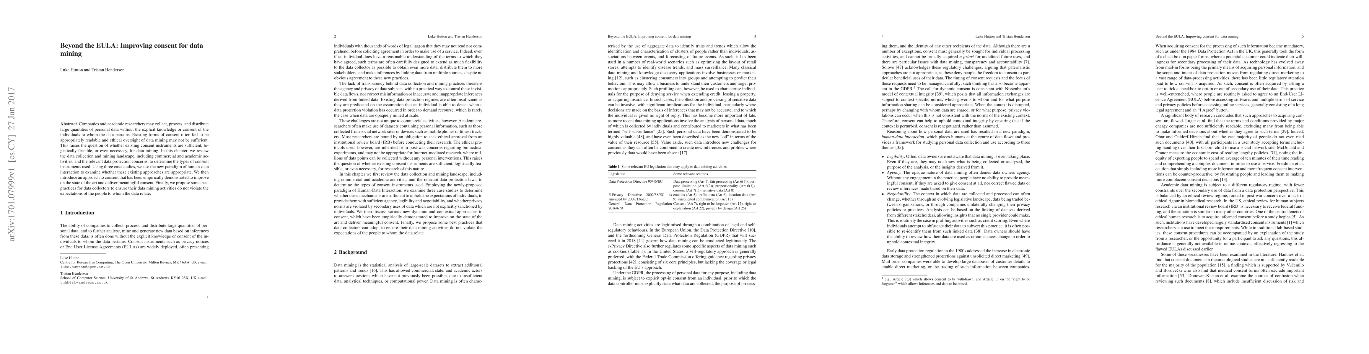 Companies and academic researchers may collect, process, and distribute large quantities of personal data without the explicit knowledge or consent of the individuals to whom the data pertains. Existing forms of consent often fail to be appropriately readable and ethical oversight of data mining may not be sufficient. This raises the question of whether existing consent instruments are sufficient, logistically feasible, or even necessary, for data mining. In this chapter, we review the data collection and mining landscape, including commercial and academic activities, and the relevant data protection concerns, to determine the types of consent instruments used. Using three case studies, we use the new paradigm of human-data interaction to examine whether these existing approaches are appropriate. We then introduce an approach to consent that has been empirically demonstrated to improve on the state of the art and deliver meaningful consent. Finally, we propose some best practices for data collectors to ensure their data mining activities do not violate the expectations of the people to whom the data relate.