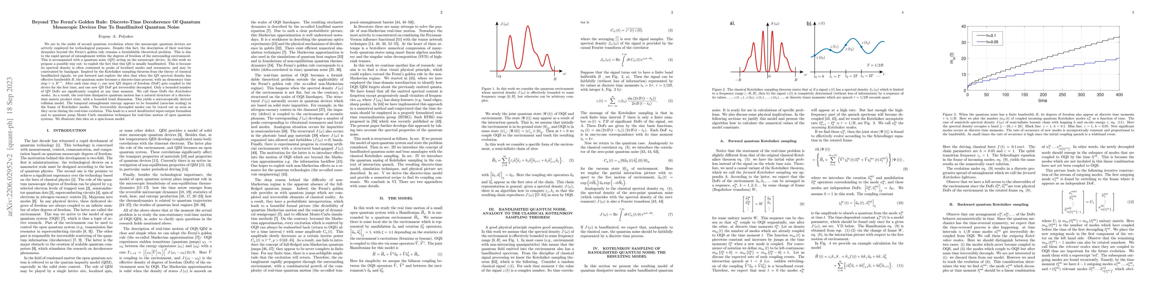 This paper proposes a novel approach to describe the real-time dynamics of mesoscopic quantum devices beyond Fermi's golden rule, by considering bandlimited quantum noise. It introduces a discrete-time decoherence model based on Kotelnikov modes, leading to a bounded bond dimension and a bounded temporal entanglement entropy, and develops a bandlimited input-output formalism and quantum jump Monte Carlo techniques for simulating open quantum systems.