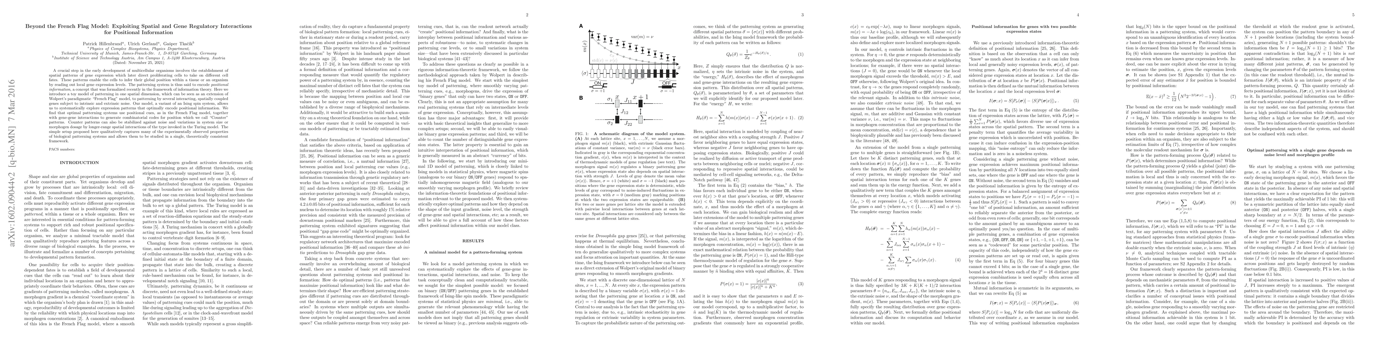 A crucial step in the early development of multicellular organisms involves the establishment of spatial patterns of gene expression which later direct proliferating cells to take on different cell fates. These patterns enable the cells to infer their global position within a tissue or an organism by reading out local gene expression levels. The patterning system is thus said to encode positional information, a concept that was formalized recently in the framework of information theory. Here we introduce a toy model of patterning in one spatial dimension, which can be seen as an extension of Wolpert's paradigmatic "French Flag" model, to patterning by several interacting, spatially coupled genes subject to intrinsic and extrinsic noise. Our model, a variant of an Ising spin system, allows us to systematically explore expression patterns that optimally encode positional information. We find that optimal patterning systems use positional cues, as in the French Flag model, together with gene-gene interactions to generate combinatorial codes for position which we call "Counter" patterns. Counter patterns can also be stabilized against noise and variations in system size or morphogen dosage by longer-range spatial interactions of the type invoked in the Turing model. The simple setup proposed here qualitatively captures many of the experimentally observed properties of biological patterning systems and allows them to be studied in a single, theoretically consistent framework.