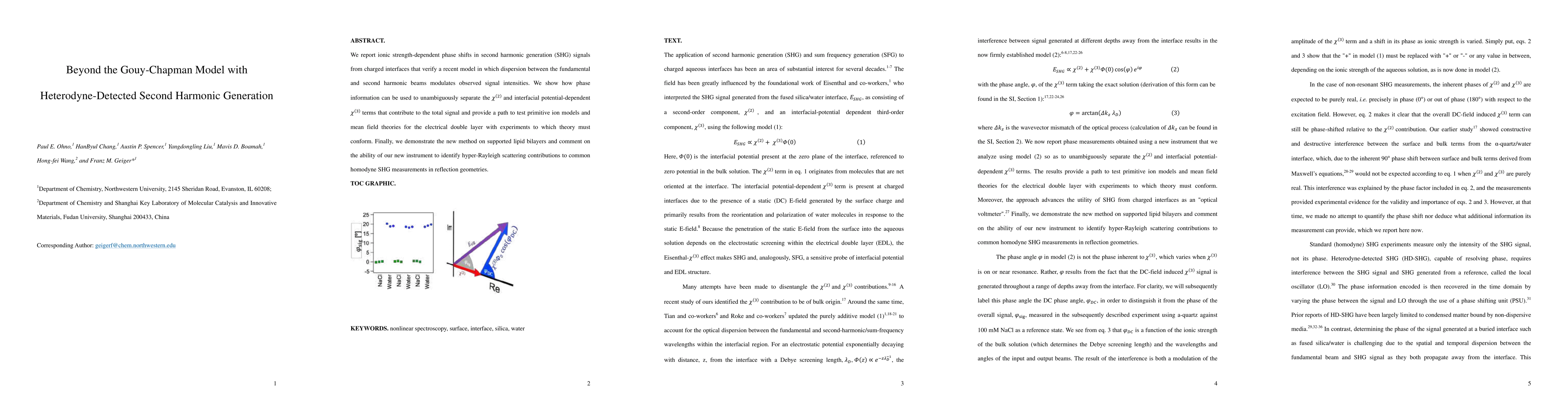 This paper reports on phase shifts in second harmonic generation (SHG) signals from charged interfaces, verifying a model where dispersion modulates signal intensities. It demonstrates how phase information can distinguish between chi(2) and chi(3) contributions, aiding in testing ion models and mean field theories for the electrical double layer.