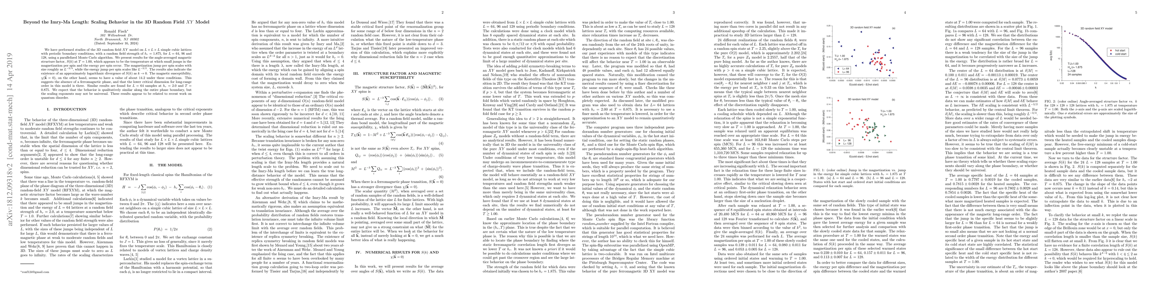 We have performed studies of the 3D random field $XY$ model on $L \times L \times L$ simple cubic lattices with periodic boundary conditions, with a random field strength of $h_r$ = 1.875, for $L =$ 64, 96 and 128, using a parallelized Monte Carlo algorithm. We present results for the angle-averaged magnetic structure factor, $S ( k )$ at $T$ = 1.00, which appears to be the temperature at which small jumps in the magnetization per spin and the energy per spin occur. The magnetization jump per spin scales with size roughly as $L^{- 3/4}$, while the energy jump per spin scales like $L^{- 3/2}$. The results also indicate the existence of an approximately logarithmic divergence of $S ( k )$ as $k \to 0$. The magnetic susceptibility, $\chi (\vec{\bf k} = 0 )$, on the other hand, seems to have a value of about 14.2 under these conditions. This suggests the absence of a ferromagnetic phase, and that the lower critical dimension for long-range order in this model is three. Similar results are found for $L$ = 64 samples at $h_r$ = 2.0 and $T$ = 0.875. We expect that the behavior is qualitatively similar along the entire phase boundary, but the scaling exponents may not be universal. These results appear to be related to recent work on quantum disorder.