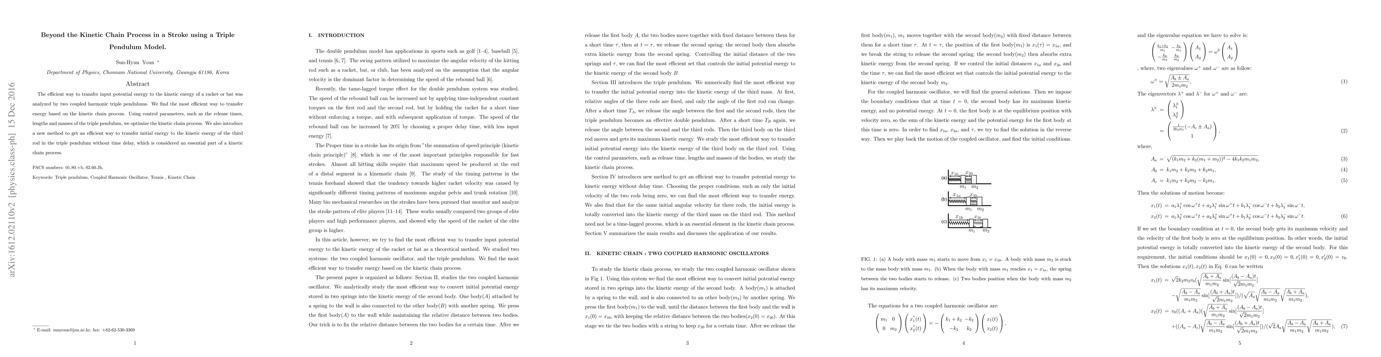 Researchers analyzed a triple pendulum model to optimize energy transfer in a stroke, finding an efficient way to convert potential energy into kinetic energy without delay. They introduced a new method to improve the kinetic chain process by optimizing release times and parameters.