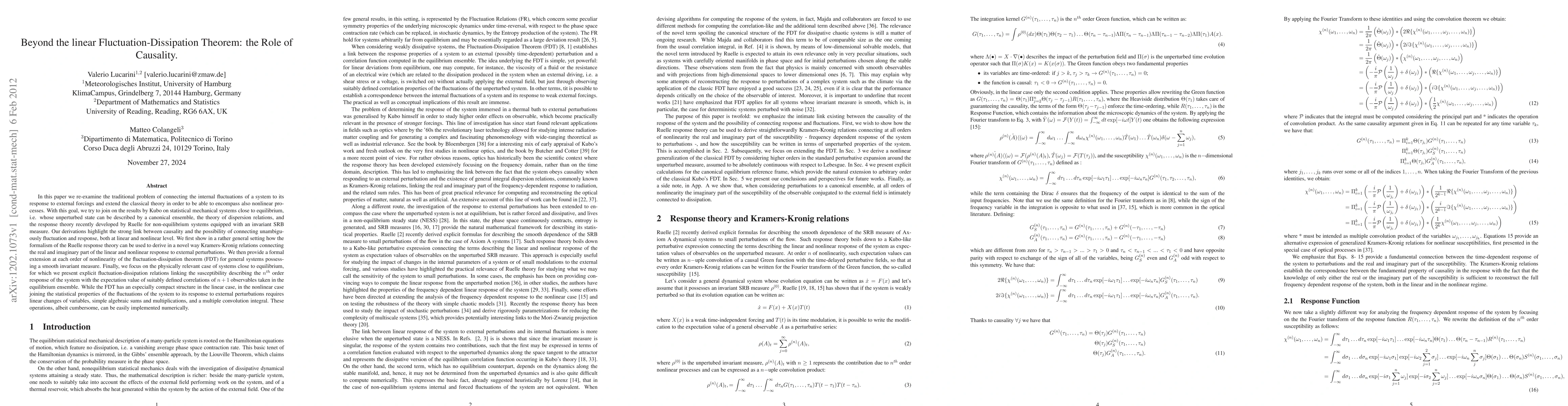 In this paper we re-examine the traditional problem of connecting the internal fluctuations of a system to its response to external forcings and extend the classical theory in order to be able to encompass also nonlinear processes. With this goal, we try to join on the results by Kubo on statistical mechanical systems close to equilibrium, i.e. whose unperturbed state can be described by a canonical ensemble, the theory of dispersion relations, and the response theory recently developed by Ruelle for non-equilibrium systems equipped with an invariant SRB measure. Our derivations highlight the strong link between causality and the possibility of connecting unambiguously fluctuation and response, both at linear and nonlinear level. We first show in a rather general setting how the formalism of the Ruelle response theory can be used to derive in a novel way Kramers-Kronig relations connecting the real and imaginary part of the linear and nonlinear response to external perturbations. We then provide a formal extension at each order of nonlinearity of the fluctuation-dissipation theorem (FDT) for general systems possessing a smooth invariant measure. Finally, we focus on the physically relevant case of systems close to equilibrium, for which we present explicit fluctuation-dissipation relations linking the susceptibility describing the $n^{th}$ order response of the system with the expectation value of suitably defined correlations of $n+1$ observables taken in the equilibrium ensemble. While the FDT has an especially compact structure in the linear case, in the nonlinear case joining the statistical properties of the fluctuations of the system to its response to external perturbations requires linear changes of variables, simple algebraic sums and multiplications, and a multiple convolution integral. These operations, albeit cumbersome, can be easily implemented numerically.