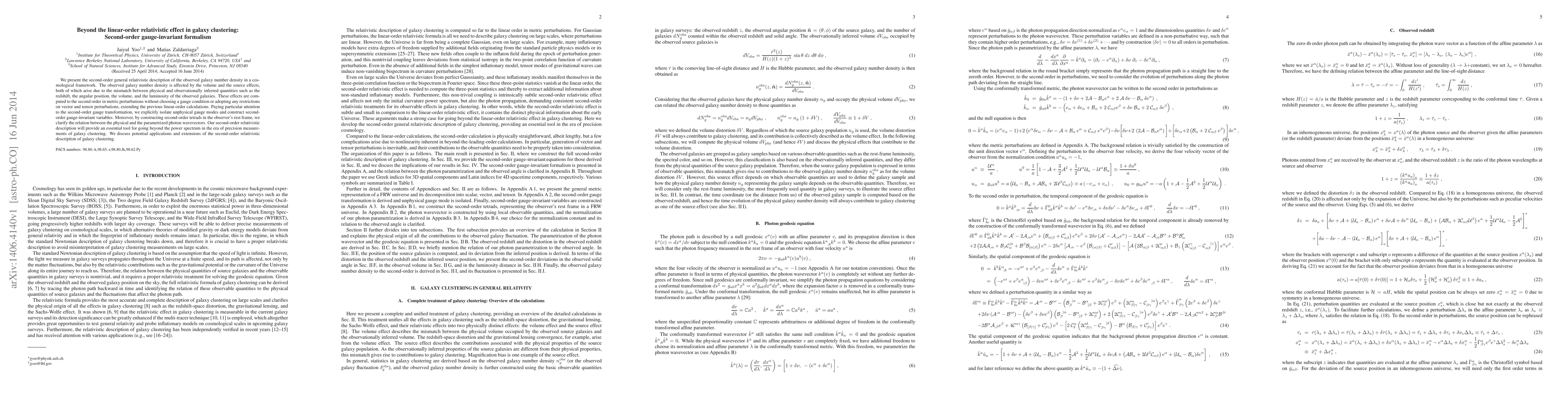 We present the second-order general relativistic description of the observed galaxy number density in a cosmological framework. The observed galaxy number density is affected by the volume and the source effects, both of which arise due to the mismatch between physical and observationally inferred quantities such as the redshift, the angular position, the volume, and the luminosity of the observed galaxies. These effects are computed to the second order in metric perturbations without choosing a gauge condition or adopting any restrictions on vector and tensor perturbations, extending the previous linear-order calculations. Paying particular attention to the second-order gauge transformation, we explicitly isolate unphysical gauge modes and construct second-order gauge-invariant variables. Moreover, by constructing second-order tetrads in the observer's rest frame, we clarify the relation between the physical and the parametrized photon wavevectors. Our second-order relativistic description will provide an essential tool for going beyond the power spectrum in the era of precision measurements of galaxy clustering. We discuss potential applications and extensions of the second-order relativistic description of galaxy clustering.