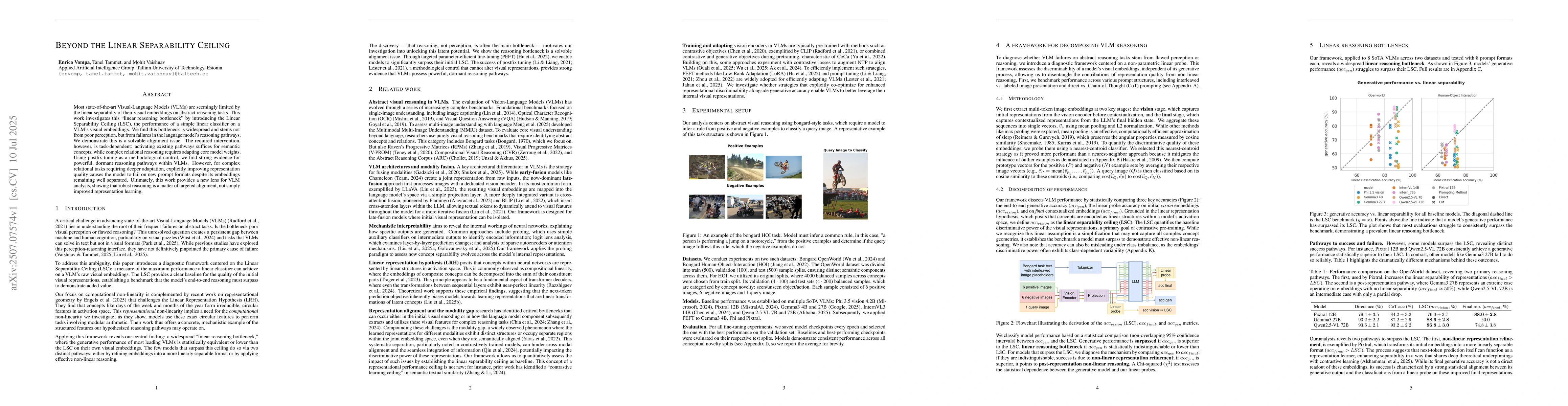 Most state-of-the-art Visual-Language Models (VLMs) are seemingly limited by the linear separabilty of their visual embeddings on abstract reasoning tasks. This work investigates this "linear reasoning bottleneck" by introducing the Linear Separability Ceiling (LSC), the performance of a simple linear classifier on a VLM's visual embeddings. We find this bottleneck is widespread and stems not from poor perception, but from failures in the language model's reasoning pathways. We demonstrate this is a solvable alignment issue. The required intervention, however, is task-dependent: activating existing pathways suffices for semantic concepts, while complex relational reasoning requires adapting core model weights. Using postfix tuning as a methodological control, we find strong evidence for powerful, dormant reasoning pathways within VLMs. However, for complex relational tasks requiring deeper adaptation, explicitly improving representation quality causes the model to fail on new prompt formats despite its embeddings remaining well separated. Ultimately, this work provides a new lens for VLM analysis, showing that robust reasoning is a matter of targeted alignment, not simply improved representation learning.