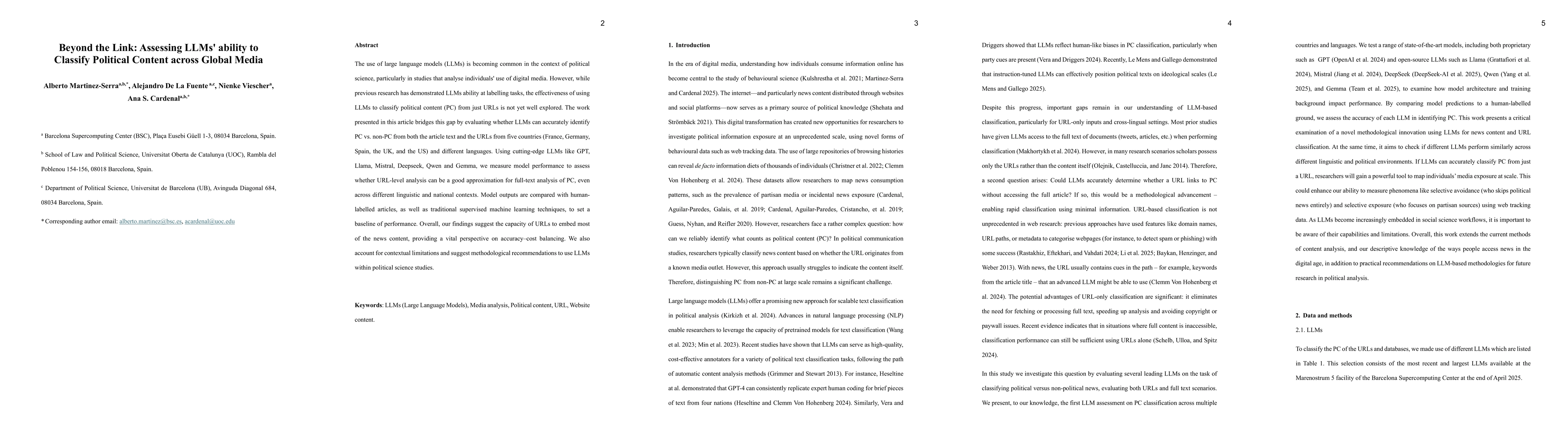 The use of large language models (LLMs) is becoming common in the context of political science, particularly in studies that analyse individuals use of digital media. However, while previous research has demonstrated LLMs ability at labelling tasks, the effectiveness of using LLMs to classify political content (PC) from just URLs is not yet well explored. The work presented in this article bridges this gap by evaluating whether LLMs can accurately identify PC vs. non-PC from both the article text and the URLs from five countries (France, Germany, Spain, the UK, and the US) and different languages. Using cutting-edge LLMs like GPT, Llama, Mistral, Deepseek, Qwen and Gemma, we measure model performance to assess whether URL-level analysis can be a good approximation for full-text analysis of PC, even across different linguistic and national contexts. Model outputs are compared with human-labelled articles, as well as traditional supervised machine learning techniques, to set a baseline of performance. Overall, our findings suggest the capacity of URLs to embed most of the news content, providing a vital perspective on accuracy-cost balancing. We also account for contextual limitations and suggest methodological recommendations to use LLMs within political science studies.