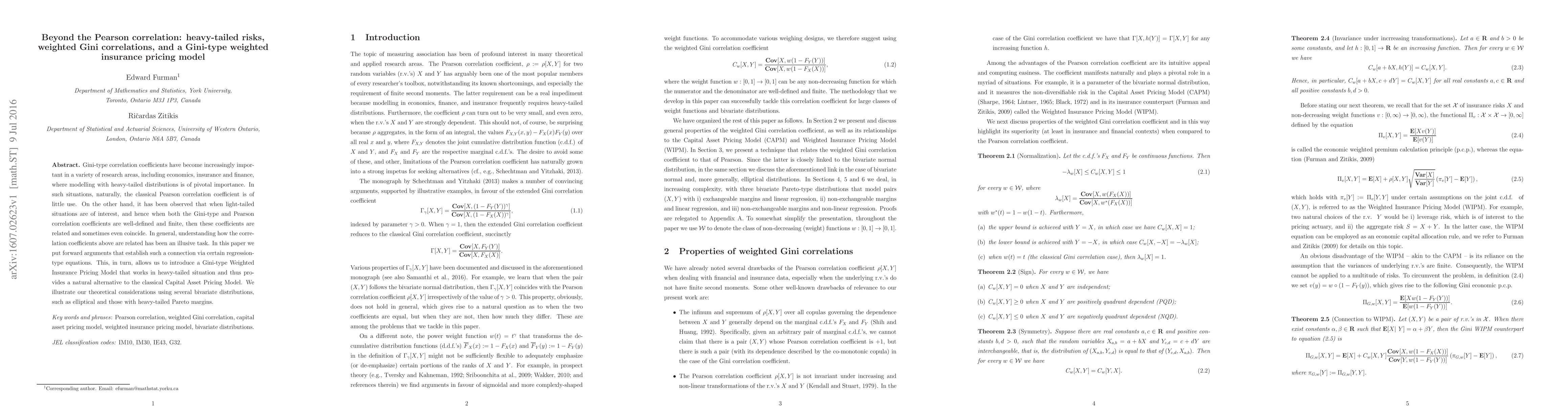 This paper introduces Gini-type correlation coefficients as alternatives to the Pearson correlation in heavy-tailed distributions, establishing a connection between them via regression-type equations. It proposes a Gini-weighted insurance pricing model as a robust alternative to the Capital Asset Pricing Model in such contexts.