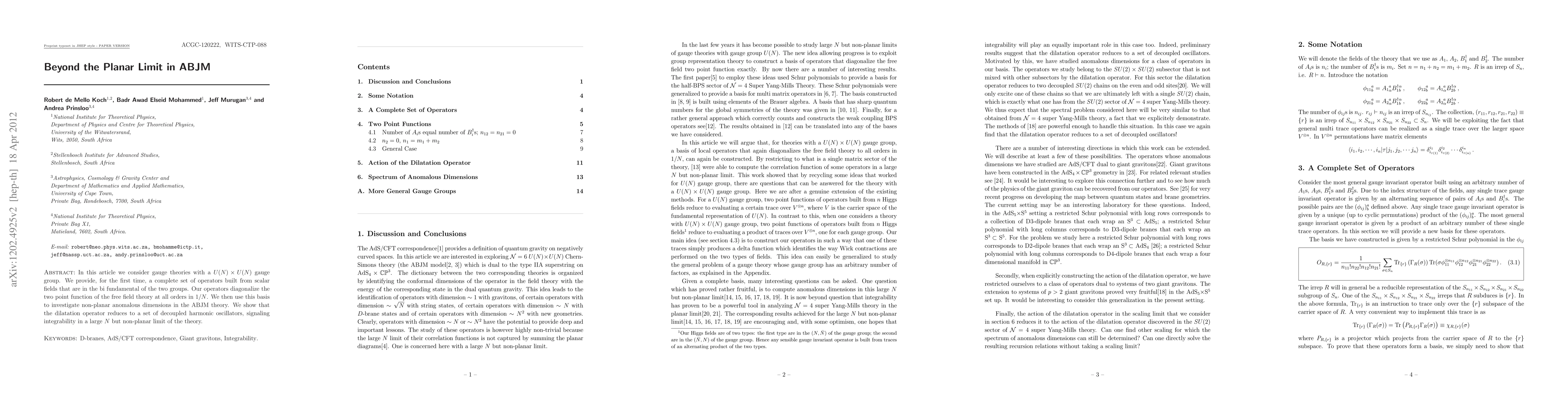 This paper constructs a complete set of operators for U(N)xU(N) gauge theories in ABJM, demonstrating their diagonalization of the two-point function at all orders. It reveals integrability in the non-planar large N limit by showing the dilatation operator simplifies to decoupled harmonic oscillators.