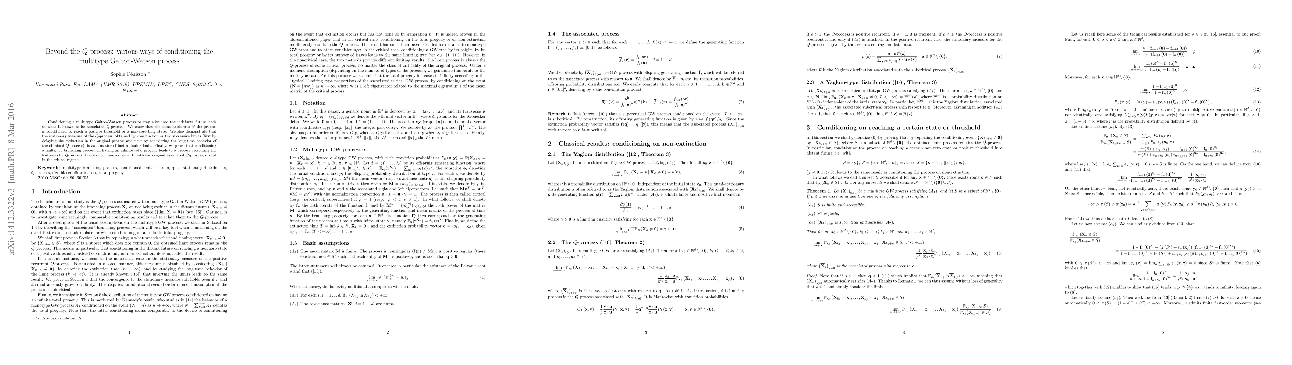 This paper explores various conditioning methods for multitype Galton-Watson processes beyond the standard $Q$-process, showing that conditioning to reach a positive threshold or non-absorbing state leads to similar results. It also reveals that the stationary measure of the $Q$-process is a double limit, and discusses the differences between conditioning on infinite total progeny and the original $Q$-process, except in the critical regime.