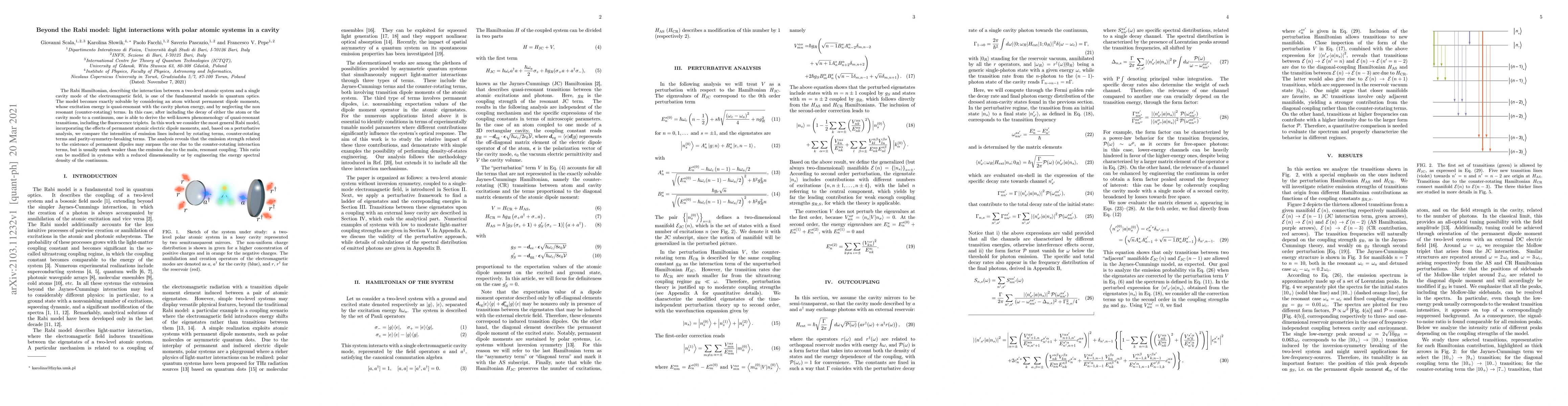 Researchers extend the Rabi model to include permanent atomic electric dipole moments, finding that emission lines due to dipoles can surpass those due to counter-rotating terms but are usually weaker than main coupling.