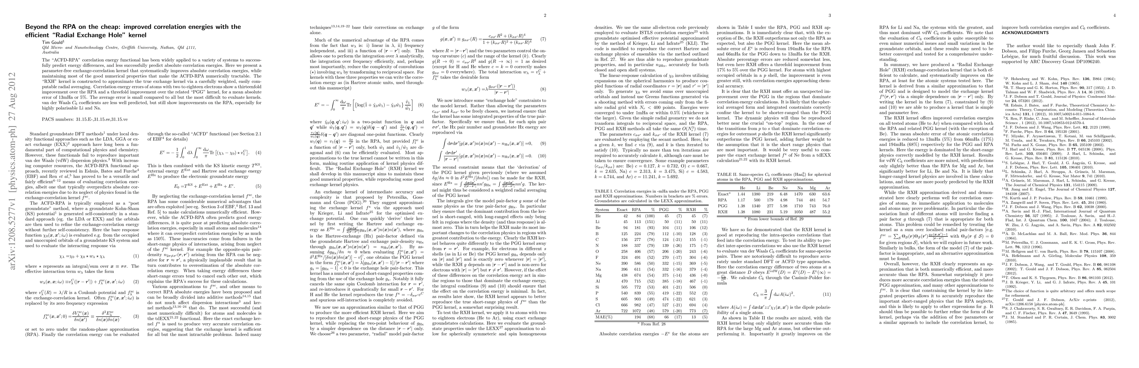 This paper introduces a new "Radial Exchange Hole" (RXH) kernel to improve the accuracy of absolute correlation energies, achieving a thirteenfold improvement over the traditional RPA method and a threefold improvement over the PGG kernel, while maintaining the computational efficiency of ACFD-RPA. The RXH kernel shows significant reductions in mean absolute error for atoms with two to eighteen electrons.