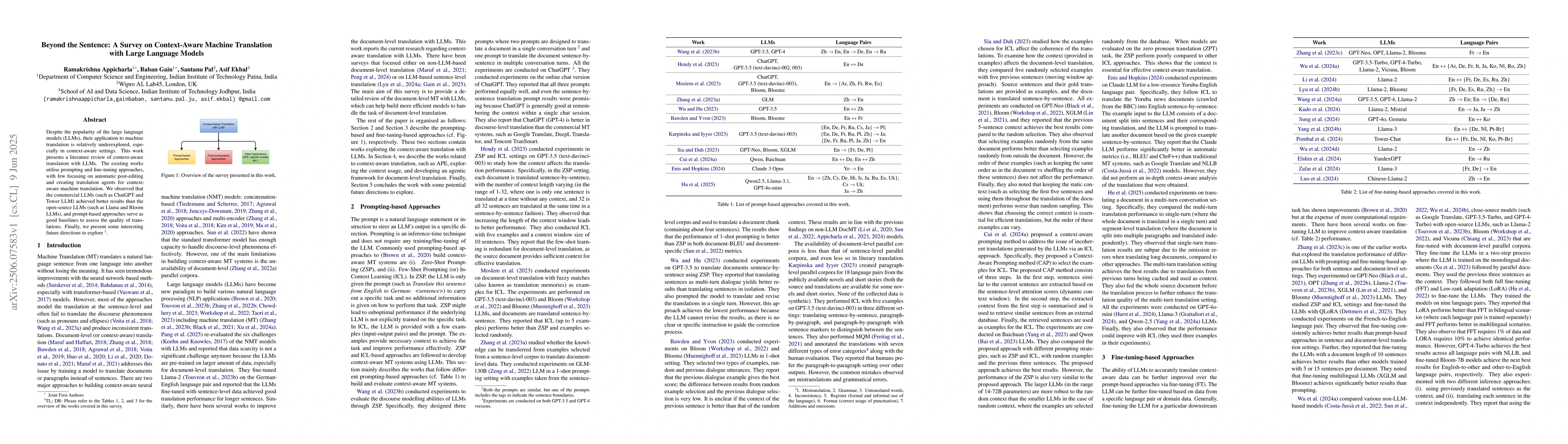 The paper presents a literature review of context-aware translation using large language models (LLMs), focusing on prompting and fine-tuning approaches, with some works exploring automatic post-editing and creating translation agents.