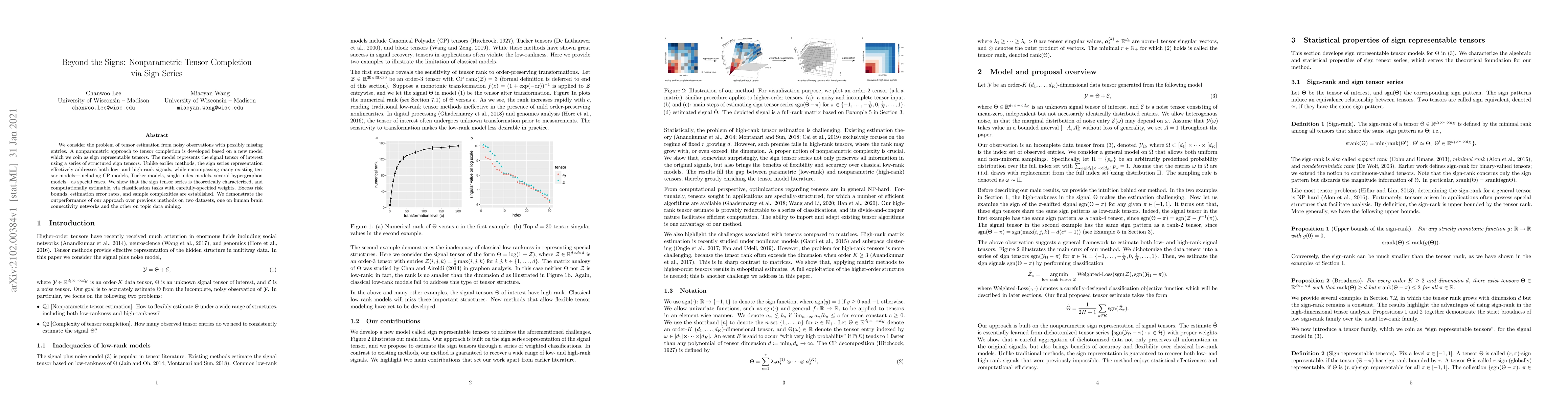 We consider the problem of tensor estimation from noisy observations with possibly missing entries. A nonparametric approach to tensor completion is developed based on a new model which we coin as sign representable tensors. The model represents the signal tensor of interest using a series of structured sign tensors. Unlike earlier methods, the sign series representation effectively addresses both low- and high-rank signals, while encompassing many existing tensor models -- including CP models, Tucker models, single index models, several hypergraphon models -- as special cases. We show that the sign tensor series is theoretically characterized, and computationally estimable, via classification tasks with carefully-specified weights. Excess risk bounds, estimation error rates, and sample complexities are established. We demonstrate the outperformance of our approach over previous methods on two datasets, one on human brain connectivity networks and the other on topic data mining.