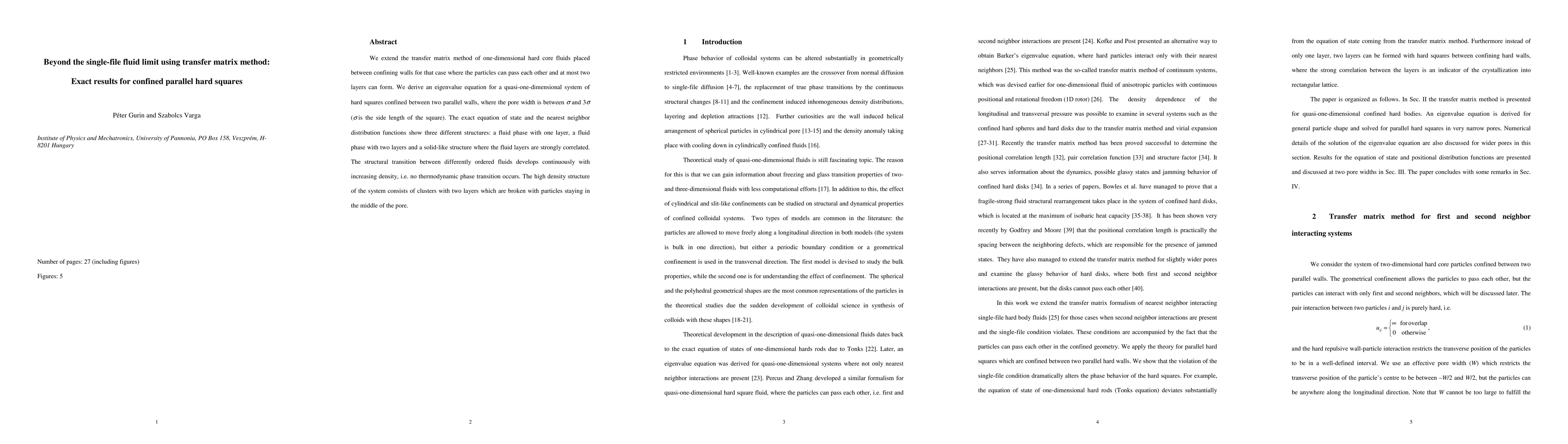 We extend the transfer matrix method of one-dimensional hard core fluids placed between confining walls for that case where the particles can pass each other and at most two layers can form. We derive an eigenvalue equation for a quasi-one-dimensional system of hard squares confined between two parallel walls, where the pore width is between $\sigma$ and $3\sigma$ ( $\sigma$ is the side length of the square). The exact equation of state and the nearest neighbour distribution functions show three different structures: a fluid phase with one layer, a fluid phase with two layers and a solid-like structure where the fluid layers are strongly correlated. The structural transition between differently ordered fluids develops continuously with increasing density, i.e. no thermodynamic phase transition occurs. The high density structure of the system consists of clusters with two layers which are broken with particles staying in the middle of the pore.