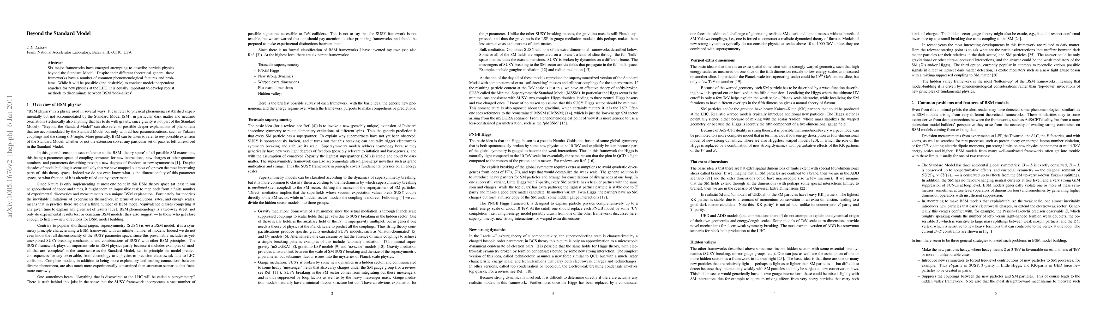 This paper discusses six major frameworks for particle physics beyond the Standard Model, highlighting their common phenomenological features and challenges. It emphasizes the need for robust methods to distinguish between these frameworks, alongside model-independent searches for new physics at the LHC.