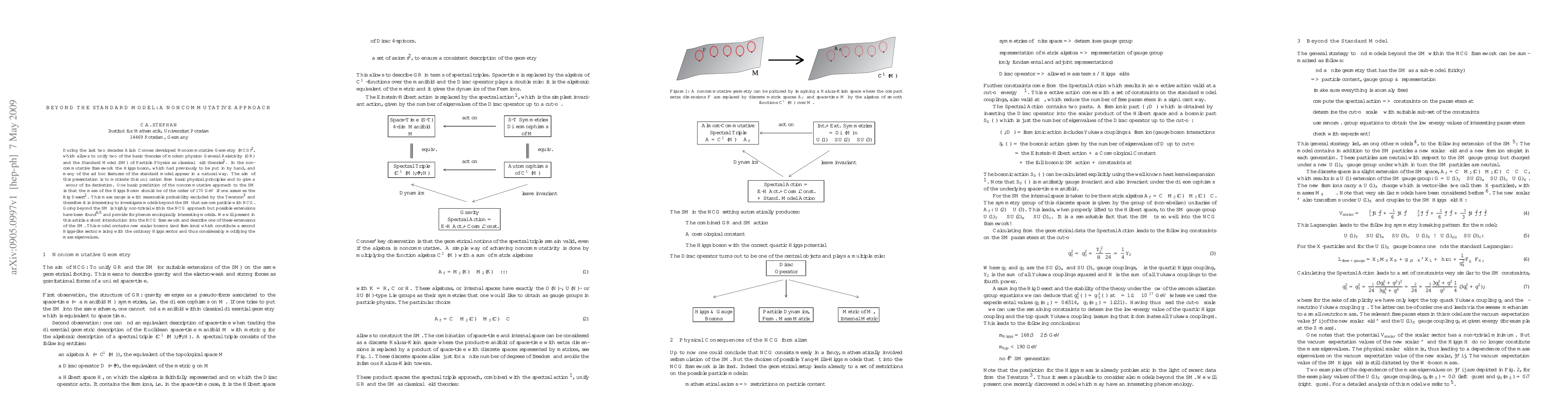 During the last two decades Alain Connes developed Noncommutative Geometry (NCG), which allows to unify two of the basic theories of modern physics: General Relativity (GR) and the Standard Model (SM) of Particle Physics as classical field theories. In the noncommutative framework the Higgs boson, which had previously to be put in by hand, and many of the ad hoc features of the standard model appear in a natural way. The aim of this presentation is to motivate this unification from basic physical principles and to give a flavour of its derivation. One basic prediction of the noncommutative approach to the SM is that the mass of the Higgs Boson should be of the order of 170 GeV if one assumes the Big Desert. This mass range is with reasonable probability excluded by the Tevatron and therefore it is interesting to investigate models beyond the SM that are compatible with NCG. Going beyond the SM is highly non-trivial within the NCG approach but possible extensions have been found and provide for phenomenologically interesting models. We will present in this article a short introduction into the NCG framework and describe one of these extensions of the SM. This model contains new scalar bosons (and fermions) which constitute a second Higgs-like sector mixing with theordinary Higgs sector and thus considerably modifying the mass eigenvalues.