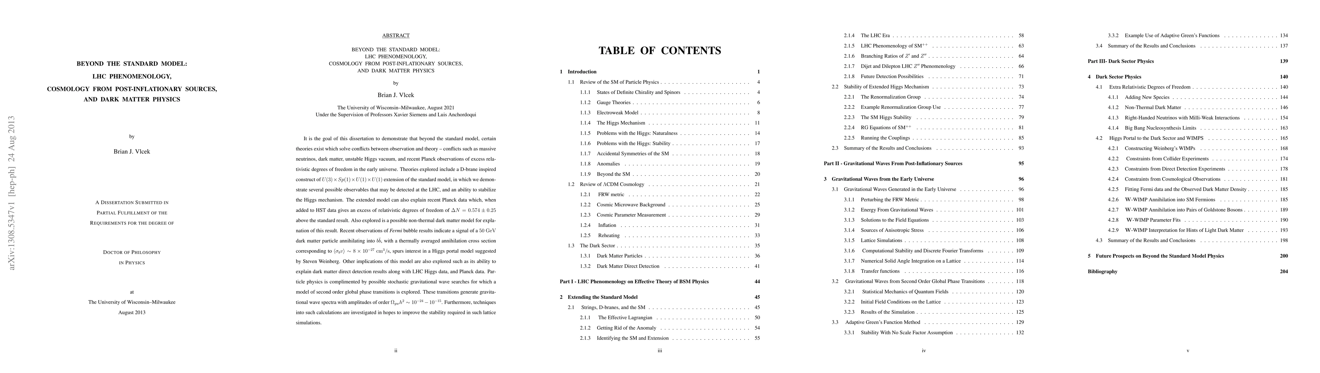It is the goal of this dissertation to demonstrate that beyond the standard model, certain theories exist which solve conflicts between observation and theory -- conflicts such as massive neutrinos, dark matter, unstable Higgs vacuum, and recent Planck observations of excess relativistic degrees of freedom in the early universe. Theories explored include a D-brane inspired construct of U(3) X Sp(1) X U(1) X U(1) extension of the standard model, in which we demonstrate several possible observables that may be detected at the LHC, and an ability to stabilize the Higgs mechanism. The extended model can also explain recent Planck data which, when added to HST data gives an excess of relativistic degrees of freedom of \Delta N = 0.574 +- 0.25 above the standard result. Also explored is a possible non-thermal dark matter model for explanation of this result. Recent observations of Fermi bubble results indicate a signal of a 50 GeV dark matter particle annihilating into b b-bar, with a thermally averaged annihilation cross section corresponding to < \sigma v> = 8 X 10^(-27) cm^3/s, spurs interest in a Higgs portal model suggested by Steven Weinberg. Other implications of this model are also explored such as its ability to explain dark matter direct detection results along with LHC Higgs data, and Planck data. Particle physics is complimented by possible stochastic gravitational wave searches for which a model of second order global phase transitions is explored. These transitions generate gravitational wave spectra with amplitudes of order \Omega_{gw} h^2 = 10^(-24) - 10^(-15). Furthermore, techniques into such calculations are investigated in hopes to improve the stability required in such lattice simulations.