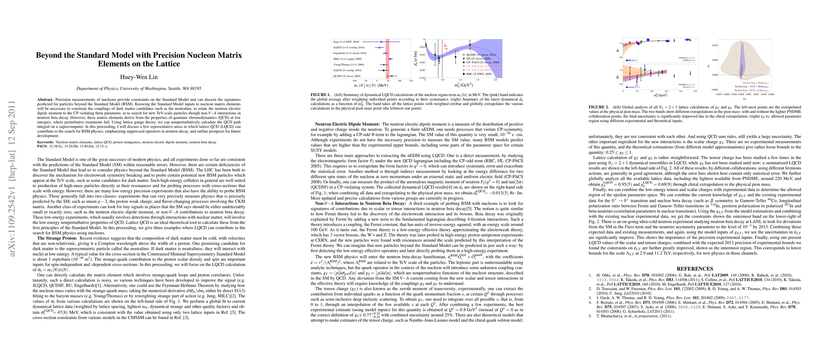 This paper explores how precision measurements of nucleon matrix elements using lattice gauge theory can provide insights into particles beyond the Standard Model. It highlights the potential of lattice QCD to calculate nonperturbative QCD effects, which are crucial for constraining dark matter couplings and searching for new physics in neutron decay.