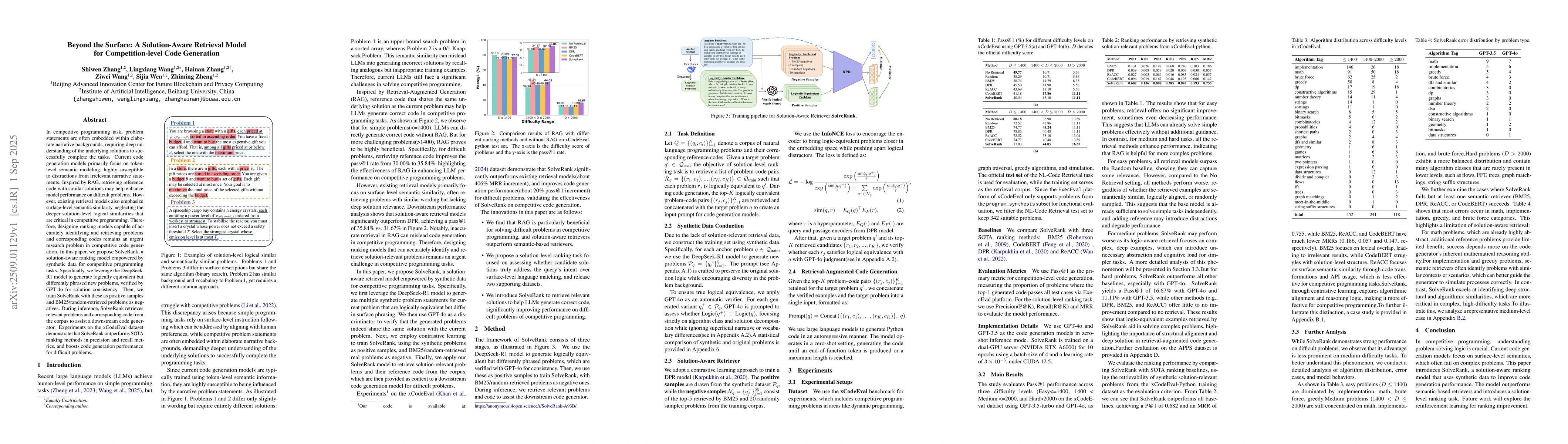 In competitive programming task, problem statements are often embedded within elaborate narrative backgrounds, requiring deep understanding of the underlying solutions to successfully complete the tasks. Current code generation models primarily focus on token-level semantic modeling, highly susceptible to distractions from irrelevant narrative statements. Inspired by RAG, retrieving reference code with similar solutions may help enhance model performance on difficult problems. However, existing retrieval models also emphasize surface-level semantic similarity, neglecting the deeper solution-level logical similarities that are critical in competitive programming. Therefore, designing ranking models capable of accurately identifying and retrieving problems and corresponding codes remains an urgent research problem in competitive code generation. In this paper, we propose SolveRank, a solution-aware ranking model empowered by synthetic data for competitive programming tasks. Specifically, we leverage the DeepSeek-R1 model to generate logically equivalent but differently phrased new problems, verified by GPT-4o for solution consistency. Then, we train SolveRank with these as positive samples and BM25/random-retrieved problems as negatives. During inference, SolveRank retrieves relevant problems and corresponding code from the corpus to assist a downstream code generator. Experiments on the xCodeEval dataset demonstrate that SolveRank outperforms SOTA ranking methods in precision and recall metrics, and boosts code generation performance for difficult problems.