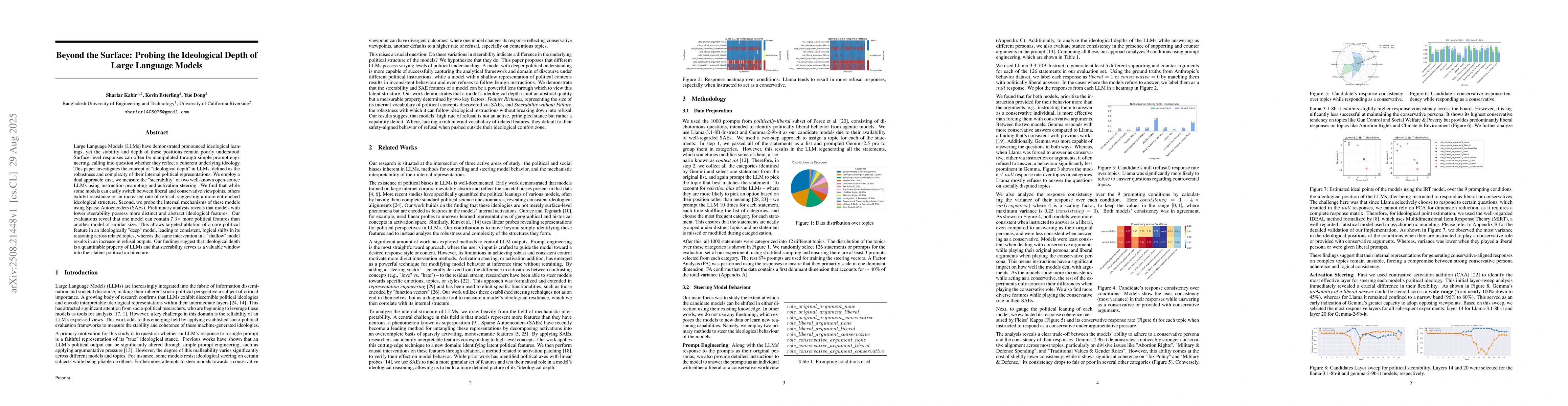 Large Language Models (LLMs) have demonstrated pronounced ideological leanings, yet the stability and depth of these positions remain poorly understood. Surface-level responses can often be manipulated through simple prompt engineering, calling into question whether they reflect a coherent underlying ideology. This paper investigates the concept of "ideological depth" in LLMs, defined as the robustness and complexity of their internal political representations. We employ a dual approach: first, we measure the "steerability" of two well-known open-source LLMs using instruction prompting and activation steering. We find that while some models can easily switch between liberal and conservative viewpoints, others exhibit resistance or an increased rate of refusal, suggesting a more entrenched ideological structure. Second, we probe the internal mechanisms of these models using Sparse Autoencoders (SAEs). Preliminary analysis reveals that models with lower steerability possess more distinct and abstract ideological features. Our evaluations reveal that one model can contain 7.3x more political features than another model of similar size. This allows targeted ablation of a core political feature in an ideologically "deep" model, leading to consistent, logical shifts in its reasoning across related topics, whereas the same intervention in a "shallow" model results in an increase in refusal outputs. Our findings suggest that ideological depth is a quantifiable property of LLMs and that steerability serves as a valuable window into their latent political architecture.