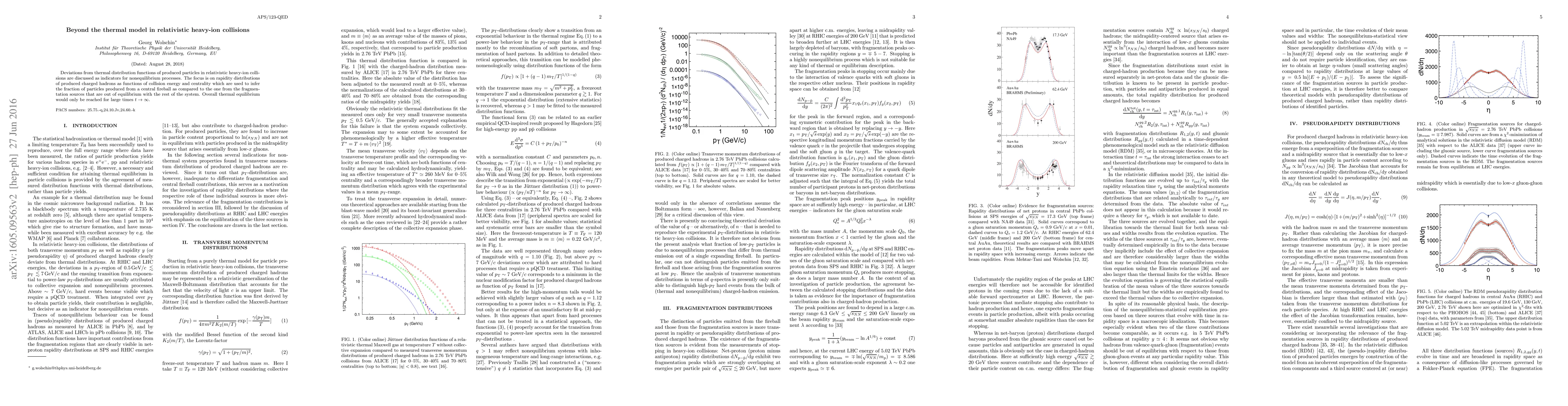 Deviations from thermal distribution functions of produced particles in relativistic heavy-ion collisions are discussed as indicators for nonequilibrium processes. The focus is on rapidity distributions of produced charged hadrons as functions of collision energy and centrality which are used to infer the fraction of produced particles from a central fireball as compared to the one from the fragmentation sources that are out of equilibrium with the rest of the system. Overall thermal equilibrium would only be reached for large times t -> infinity.