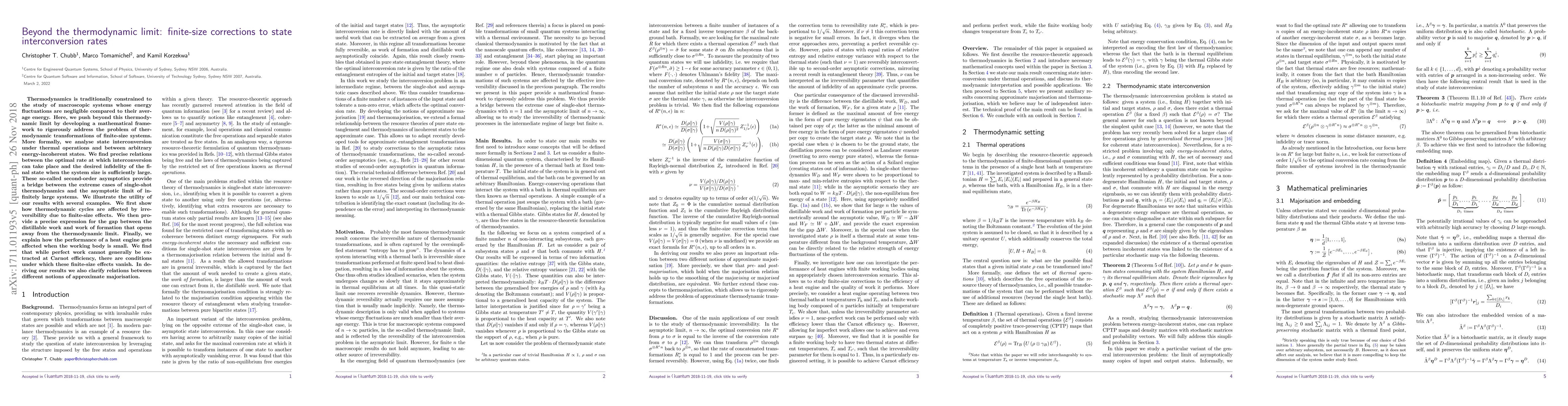 Thermodynamics is traditionally constrained to the study of macroscopic systems whose energy fluctuations are negligible compared to their average energy. Here, we push beyond this thermodynamic limit by developing a mathematical framework to rigorously address the problem of thermodynamic transformations of finite-size systems. More formally, we analyse state interconversion under thermal operations and between arbitrary energy-incoherent states. We find precise relations between the optimal rate at which interconversion can take place and the desired infidelity of the final state when the system size is sufficiently large. These so-called second-order asymptotics provide a bridge between the extreme cases of single-shot thermodynamics and the asymptotic limit of infinitely large systems. We illustrate the utility of our results with several examples. We first show how thermodynamic cycles are affected by irreversibility due to finite-size effects. We then provide a precise expression for the gap between the distillable work and work of formation that opens away from the thermodynamic limit. Finally, we explain how the performance of a heat engine gets affected when one of the heat baths it operates between is finite. We find that while perfect work cannot generally be extracted at Carnot efficiency, there are conditions under which these finite-size effects vanish. In deriving our results we also clarify relations between different notions of approximate majorisation.