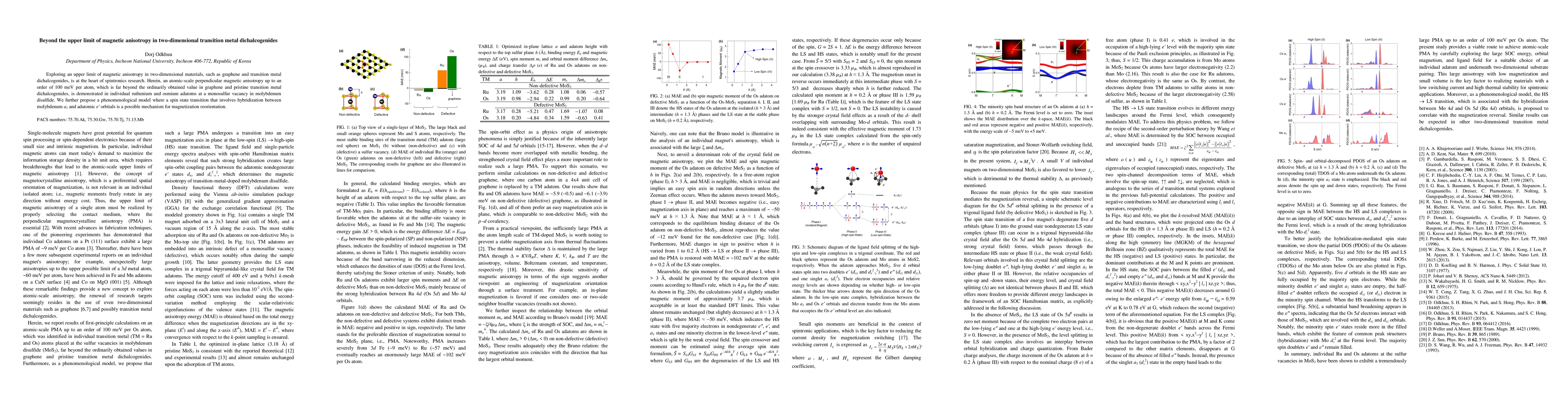 Summary: This paper demonstrates unprecedented atomic-scale perpendicular magnetic anisotropy of up to 100 meV per atom in ruthenium and osmium adatoms at a monosulfur vacancy in molybdenum disulfide, far exceeding typical values in graphene and pristine transition metal dichalcogenides. A phenomenological model suggests that spin state transitions through orbital hybridization may drive magnetization reorientation.