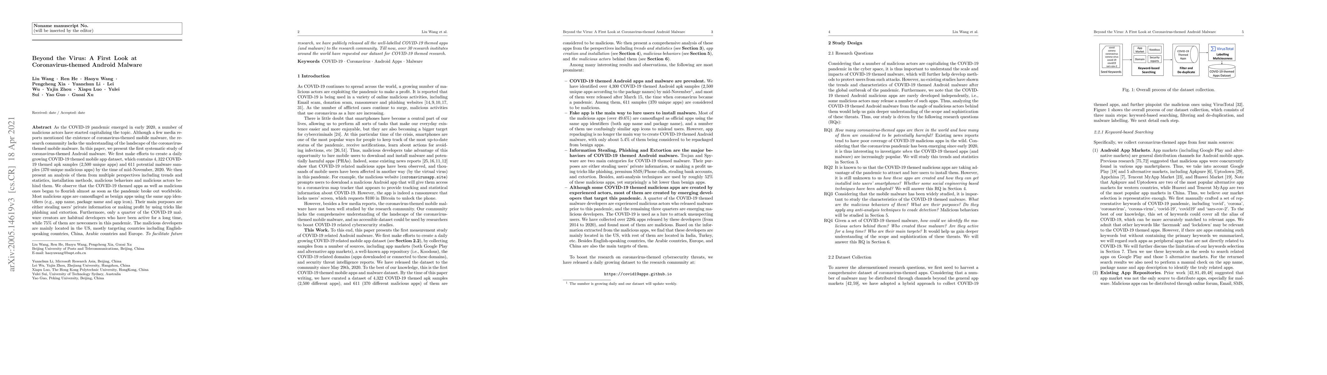 As the COVID-19 pandemic emerged in early 2020, a number of malicious actors have started capitalizing the topic. Although a few media reports mentioned the existence of coronavirus-themed mobile malware, the research community lacks the understanding of the landscape of the coronavirus-themed mobile malware. In this paper, we present the first systematic study of coronavirus-themed Android malware. We first make efforts to create a daily growing COVID-19 themed mobile app dataset, which contains 4,322 COVID-19 themed apk samples (2,500 unique apps) and 611 potential malware samples (370 unique malicious apps) by the time of mid-November, 2020. We then present an analysis of them from multiple perspectives including trends and statistics, installation methods, malicious behaviors and malicious actors behind them. We observe that the COVID-19 themed apps as well as malicious ones began to flourish almost as soon as the pandemic broke out worldwide. Most malicious apps are camouflaged as benign apps using the same app identifiers (e.g., app name, package name and app icon). Their main purposes are either stealing users' private information or making profit by using tricks like phishing and extortion. Furthermore, only a quarter of the COVID-19 malware creators are habitual developers who have been active for a long time, while 75% of them are newcomers in this pandemic. The malicious developers are mainly located in US, mostly targeting countries including English-speaking countries, China, Arabic countries and Europe. To facilitate future research, we have publicly released all the well-labelled COVID-19 themed apps (and malware) to the research community. Till now, over 30 research institutes around the world have requested our dataset for COVID-19 themed research.