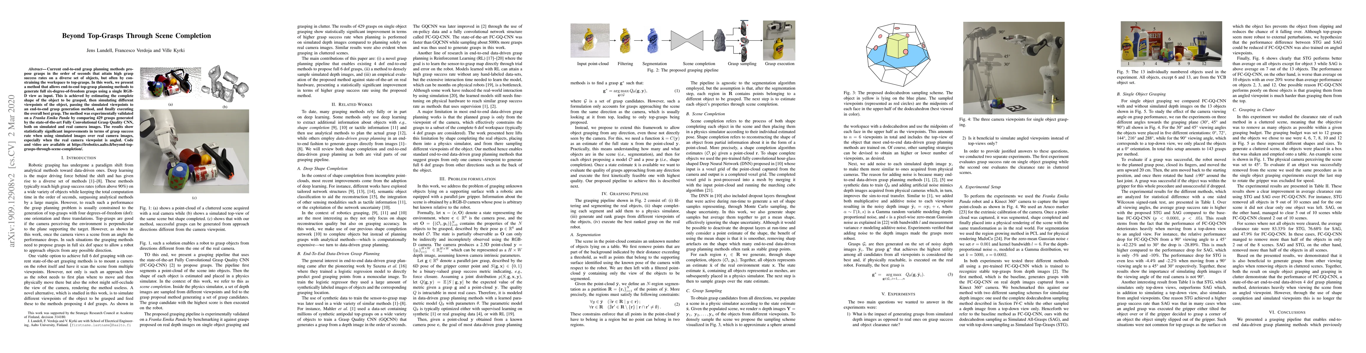 Current end-to-end grasp planning methods propose grasps in the order of seconds that attain high grasp success rates on a diverse set of objects, but often by constraining the workspace to top-grasps. In this work, we present a method that allows end-to-end top-grasp planning methods to generate full six-degree-of-freedom grasps using a single RGB-D view as input. This is achieved by estimating the complete shape of the object to be grasped, then simulating different viewpoints of the object, passing the simulated viewpoints to an end-to-end grasp generation method, and finally executing the overall best grasp. The method was experimentally validated on a Franka Emika Panda by comparing 429 grasps generated by the state-of-the-art Fully Convolutional Grasp Quality CNN, both on simulated and real camera images. The results show statistically significant improvements in terms of grasp success rate when using simulated images over real camera images, especially when the real camera viewpoint is angled. Code and video are available at https://irobotics.aalto.fi/beyond-top-grasps-through-scene-completion/.
