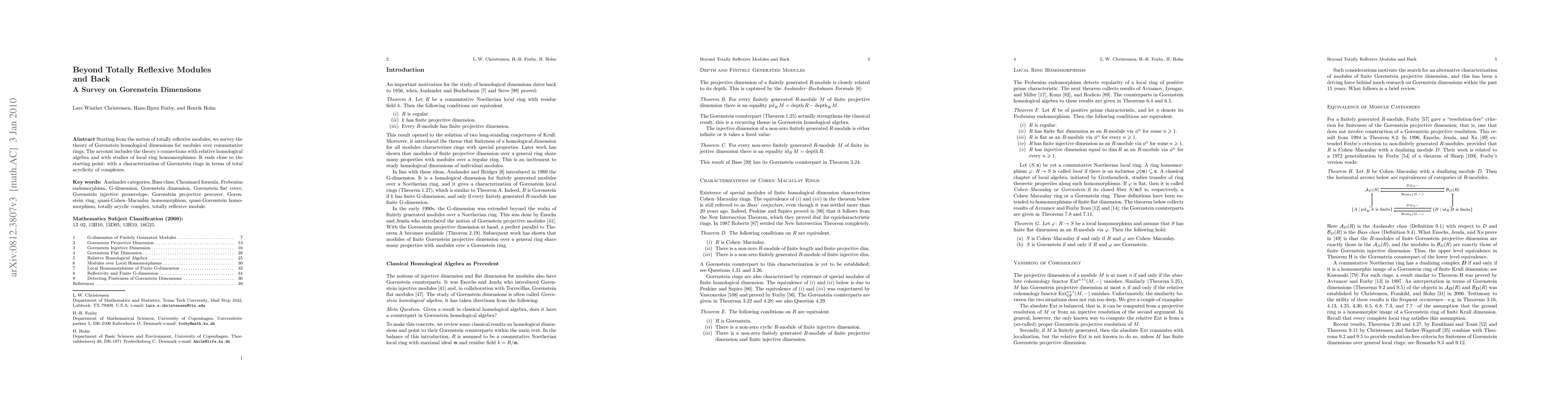 Starting from the notion of totally reflexive modules, we survey the theory of Gorenstein homological dimensions for modules over commutative rings. The account includes the theory's connections with relative homological algebra and with studies of local ring homomorphisms. It ends close to the starting point: with a characterization of Gorenstein rings in terms of total acyclicity of complexes.