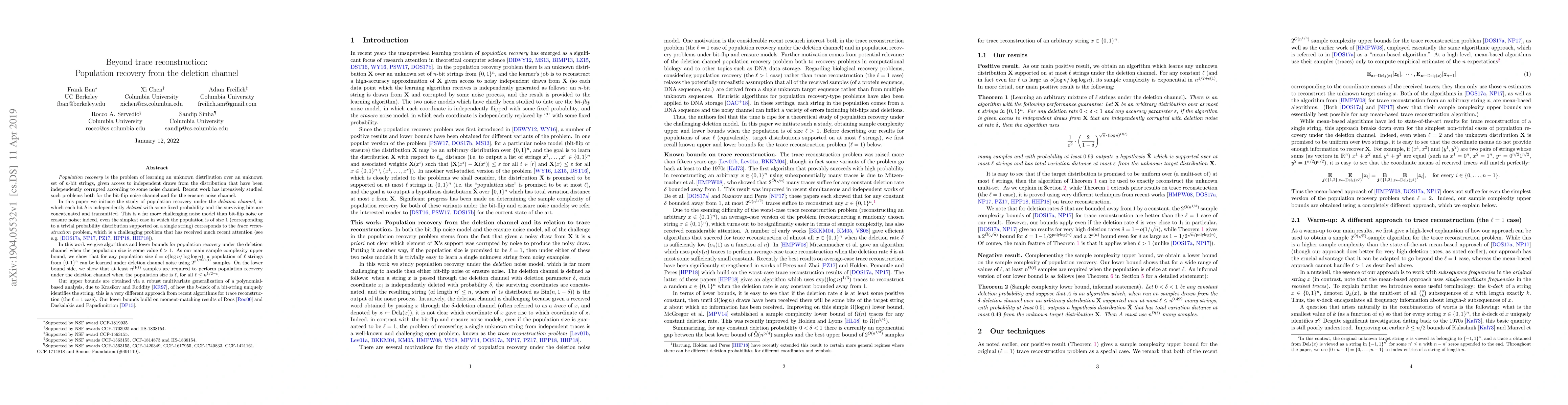 A new research paper introduces a noise channel where bits can be deleted instead of flipped or erased, making it more challenging to recover an unknown population. It provides algorithms and lower bounds for recovering populations with a fixed probability of deletion.