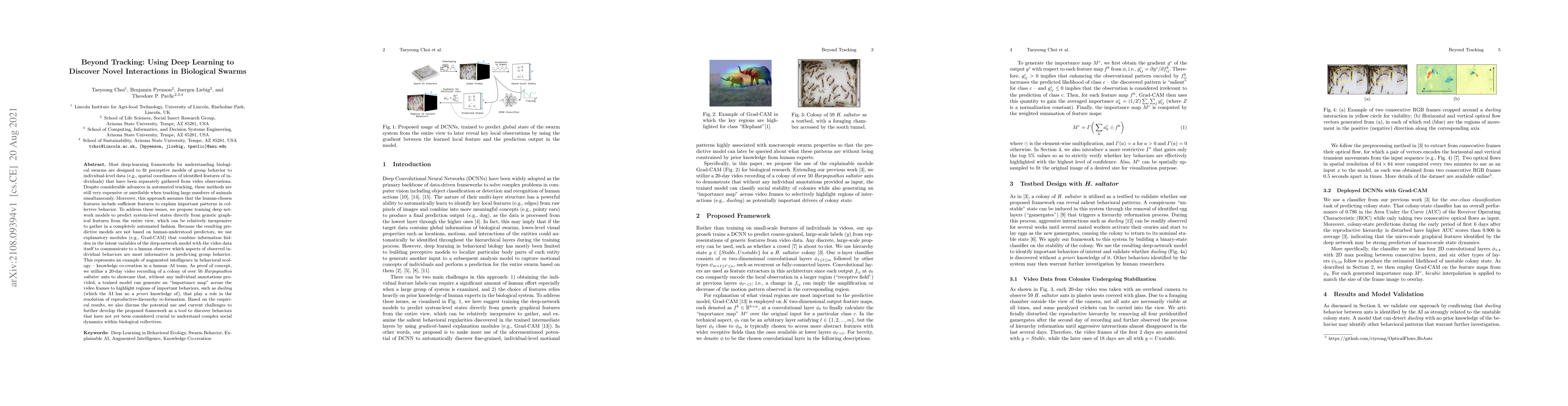 Most deep-learning frameworks for understanding biological swarms are designed to fit perceptive models of group behavior to individual-level data (e.g., spatial coordinates of identified features of individuals) that have been separately gathered from video observations. Despite considerable advances in automated tracking, these methods are still very expensive or unreliable when tracking large numbers of animals simultaneously. Moreover, this approach assumes that the human-chosen features include sufficient features to explain important patterns in collective behavior. To address these issues, we propose training deep network models to predict system-level states directly from generic graphical features from the entire view, which can be relatively inexpensive to gather in a completely automated fashion. Because the resulting predictive models are not based on human-understood predictors, we use explanatory modules (e.g., Grad-CAM) that combine information hidden in the latent variables of the deep-network model with the video data itself to communicate to a human observer which aspects of observed individual behaviors are most informative in predicting group behavior. This represents an example of augmented intelligence in behavioral ecology -- knowledge co-creation in a human-AI team. As proof of concept, we utilize a 20-day video recording of a colony of over 50 Harpegnathos saltator ants to showcase that, without any individual annotations provided, a trained model can generate an "importance map" across the video frames to highlight regions of important behaviors, such as dueling (which the AI has no a priori knowledge of), that play a role in the resolution of reproductive-hierarchy re-formation. Based on the empirical results, we also discuss the potential use and current challenges.
