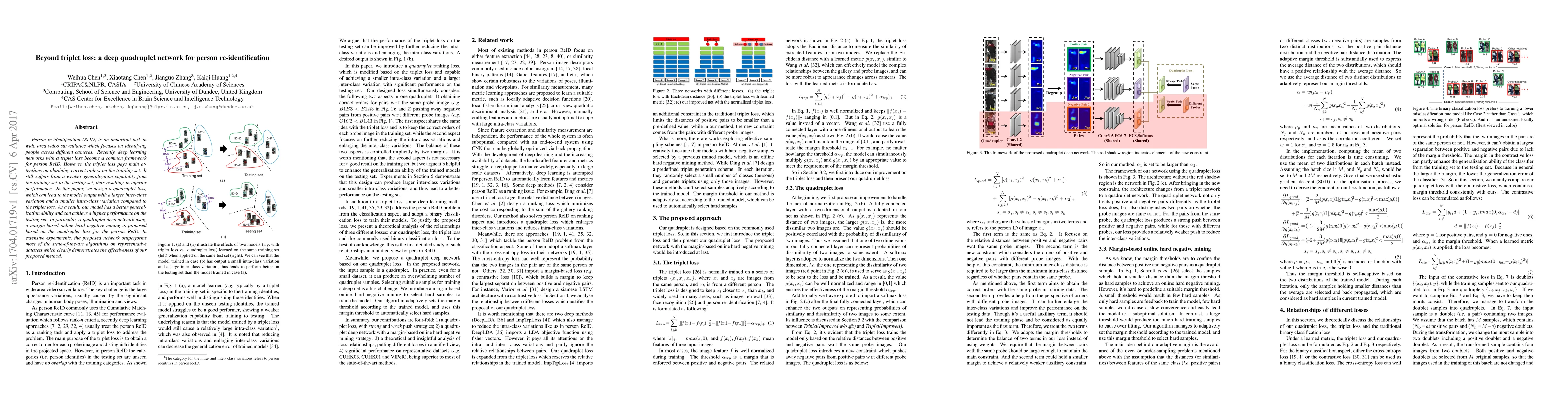 Person re-identification (ReID) is an important task in wide area video surveillance which focuses on identifying people across different cameras. Recently, deep learning networks with a triplet loss become a common framework for person ReID. However, the triplet loss pays main attentions on obtaining correct orders on the training set. It still suffers from a weaker generalization capability from the training set to the testing set, thus resulting in inferior performance. In this paper, we design a quadruplet loss, which can lead to the model output with a larger inter-class variation and a smaller intra-class variation compared to the triplet loss. As a result, our model has a better generalization ability and can achieve a higher performance on the testing set. In particular, a quadruplet deep network using a margin-based online hard negative mining is proposed based on the quadruplet loss for the person ReID. In extensive experiments, the proposed network outperforms most of the state-of-the-art algorithms on representative datasets which clearly demonstrates the effectiveness of our proposed method.