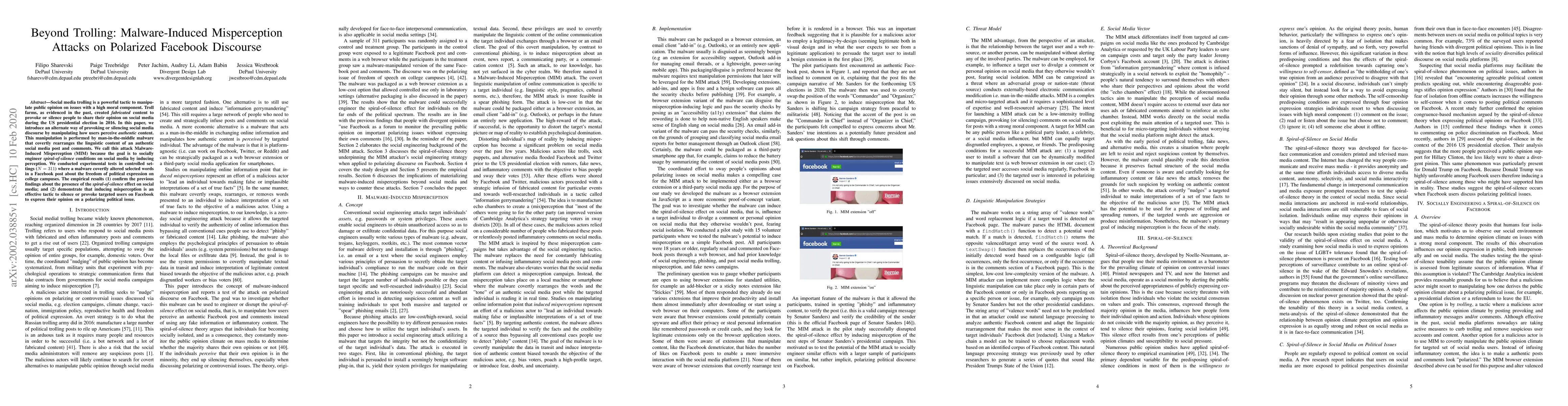 This research introduces Malware-Induced Misperception (MIM) attacks, where malware covertly rearranges social media content to manipulate user perceptions and provoke or silence discourse on polarizing topics. Experiments with 311 participants on Facebook posts about political expression confirmed the spiral-of-silence effect and demonstrated MIM's effectiveness in influencing user engagement.
