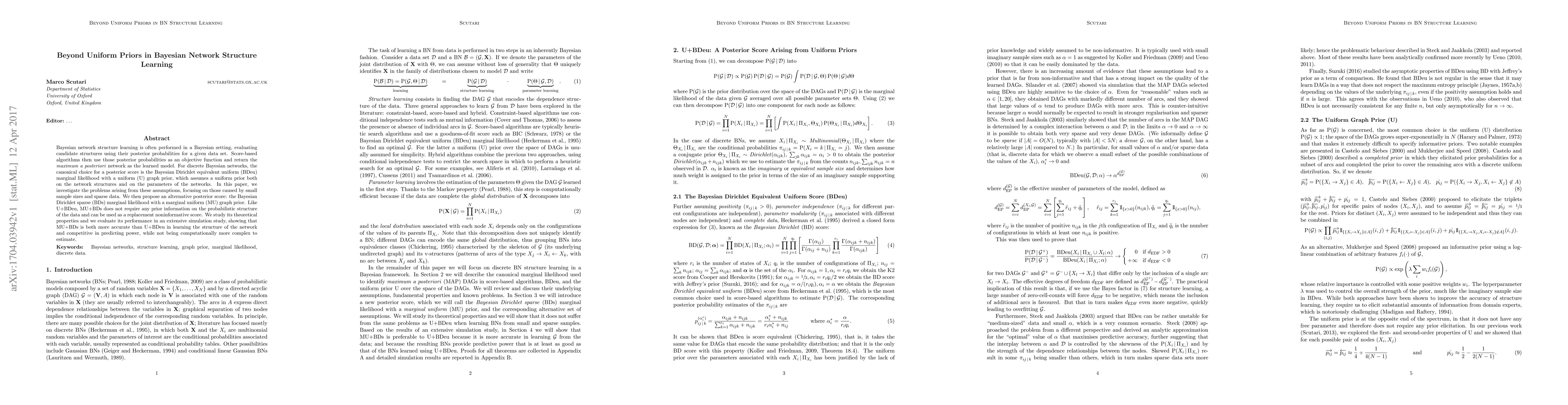 This paper critiques the use of uniform priors in Bayesian network structure learning, especially under small sample sizes and sparse data. It proposes the Bayesian Dirichlet sparse (BDs) marginal likelihood with a marginal uniform (MU) graph prior as a more accurate alternative to the traditional Bayesian Dirichlet equivalent uniform (BDeu) score, demonstrating improved structure learning and competitive predictive power.