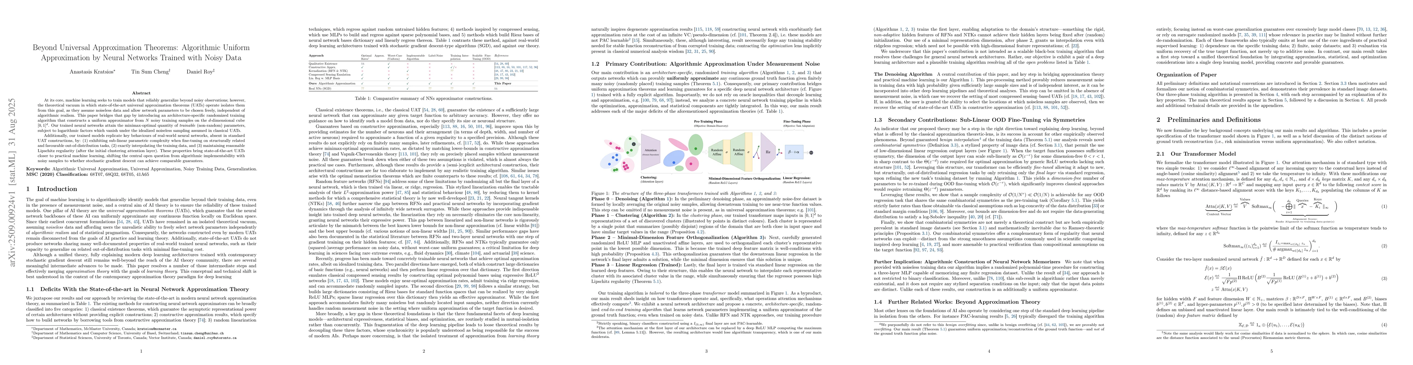 At its core, machine learning seeks to train models that reliably generalize beyond noisy observations; however, the theoretical vacuum in which state-of-the-art universal approximation theorems (UATs) operate isolates them from this goal, as they assume noiseless data and allow network parameters to be chosen freely, independent of algorithmic realism. This paper bridges that gap by introducing an architecture-specific randomized training algorithm that constructs a uniform approximator from $N$ noisy training samples on the $d$-dimensional cube $[0,1]^d$. Our trained neural networks attain the minimax-optimal quantity of \textit{trainable} (non-random) parameters, subject to logarithmic factors which vanish under the idealized noiseless sampling assumed in classical UATs. Additionally, our trained models replicate key behaviours of real-world neural networks, absent in standard UAT constructions, by: (1) exhibiting sub-linear parametric complexity when fine-tuning on structurally related and favourable out-of-distribution tasks, (2) exactly interpolating the training data, and (3) maintaining reasonable Lipschitz regularity (after the initial clustering attention layer). These properties bring state-of-the-art UATs closer to practical machine learning, shifting the central open question from algorithmic implementability with noisy samples to whether stochastic gradient descent can achieve comparable guarantees.