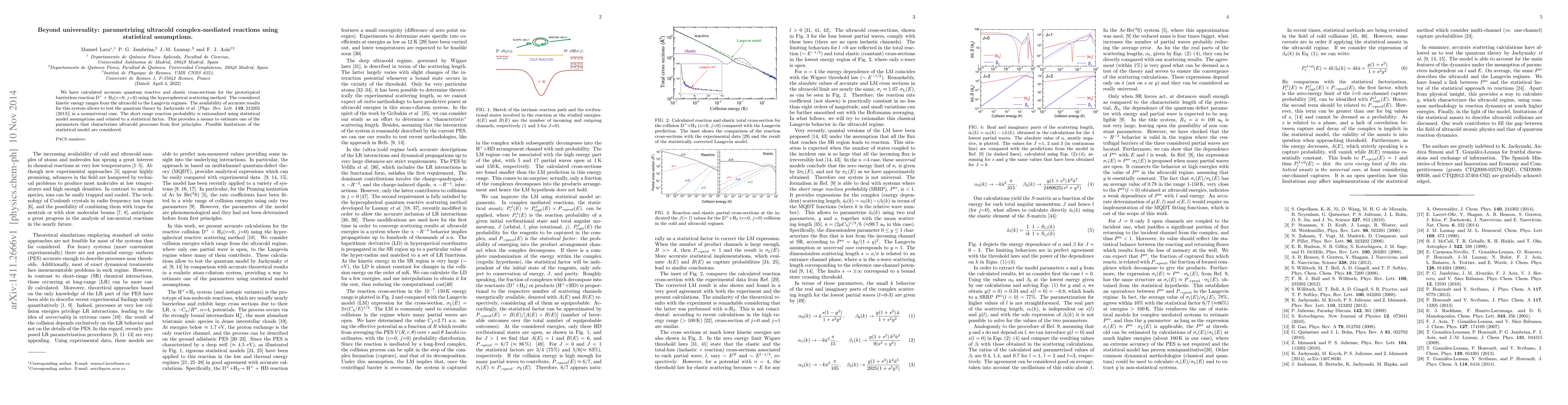 We have calculated accurate quantum reactive and elastic cross-sections for the prototypical barrierless reaction D$^{+}$ + H$_2$($v$=0, $j$=0) using the hyperspherical scattering method. The considered kinetic energy ranges from the ultracold to the Langevin regimes. The availability of accurate results for this system allows to test the quantum theory by Jachymski et al. [Phys. Rev. Lett. 110, 213202 (2013)] in a nonuniversal case. The short range reaction probability is rationalized using statistical model assumptions and related to a statistical factor. This provides a means to estimate one of the parameters that characterizes ultracold processes from first principles. Possible limitations of the statistical model are considered.